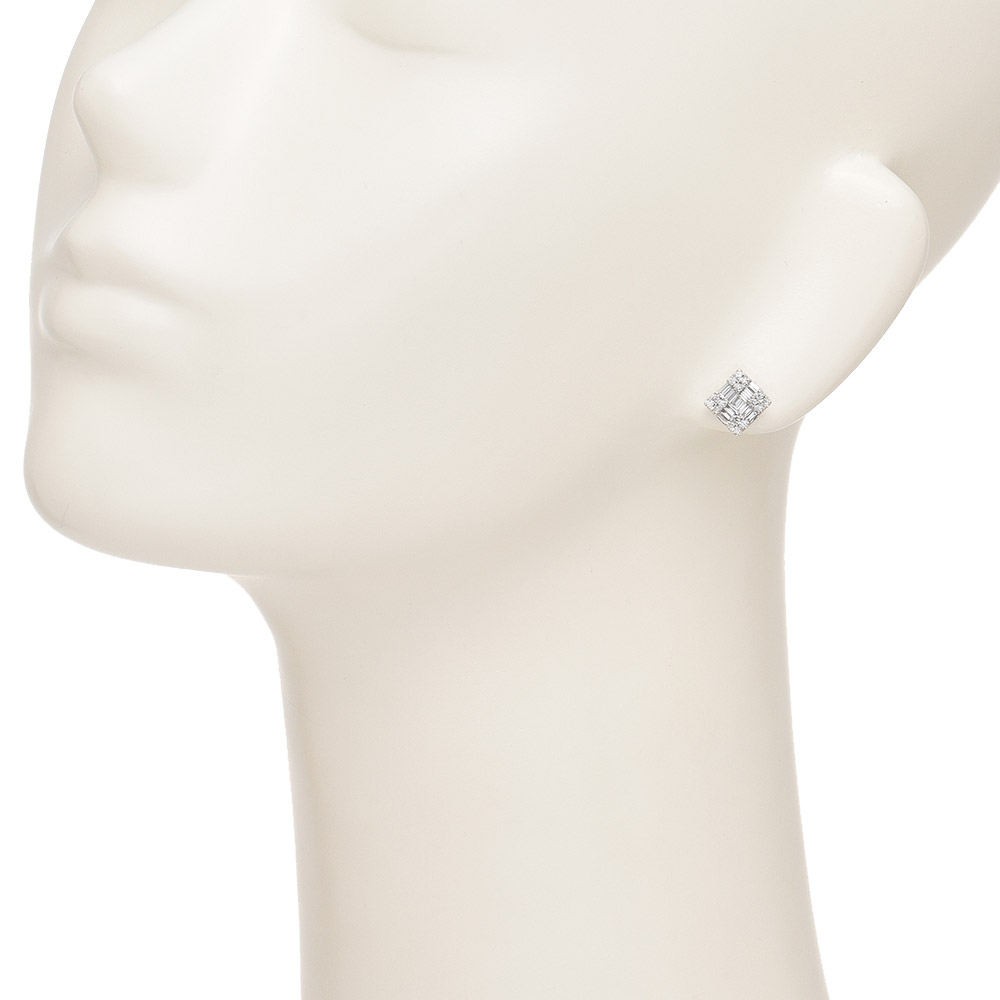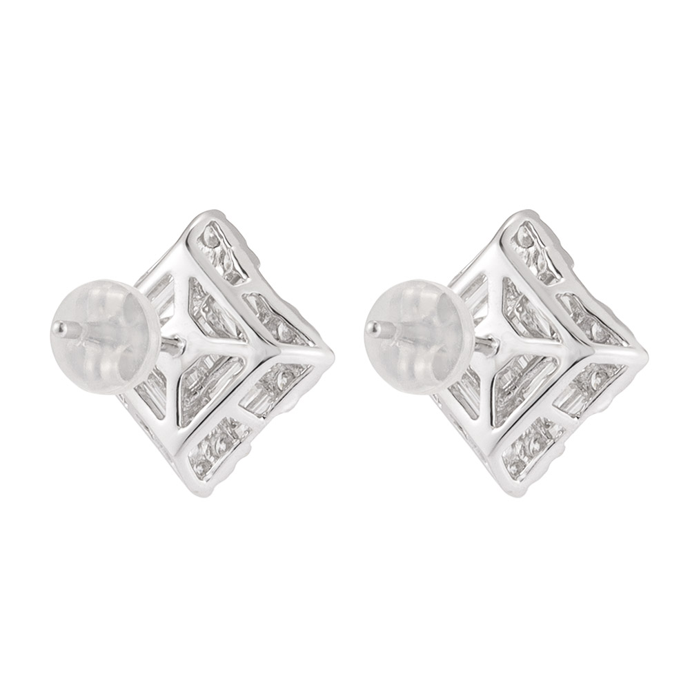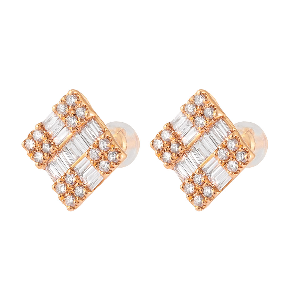 バゲットカットダイヤの四隅にラウンドダイヤをセット。輝きの対比がリュクスな個性を放つスクエアシェイプのピアス。