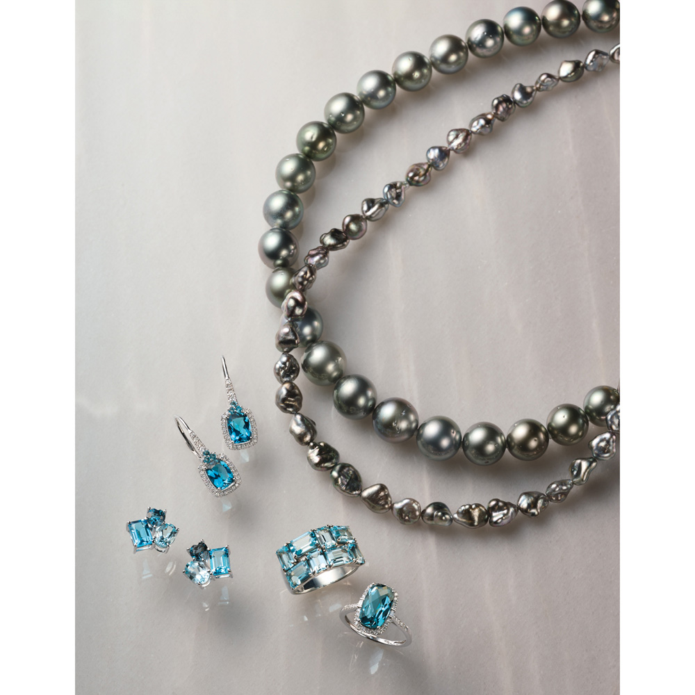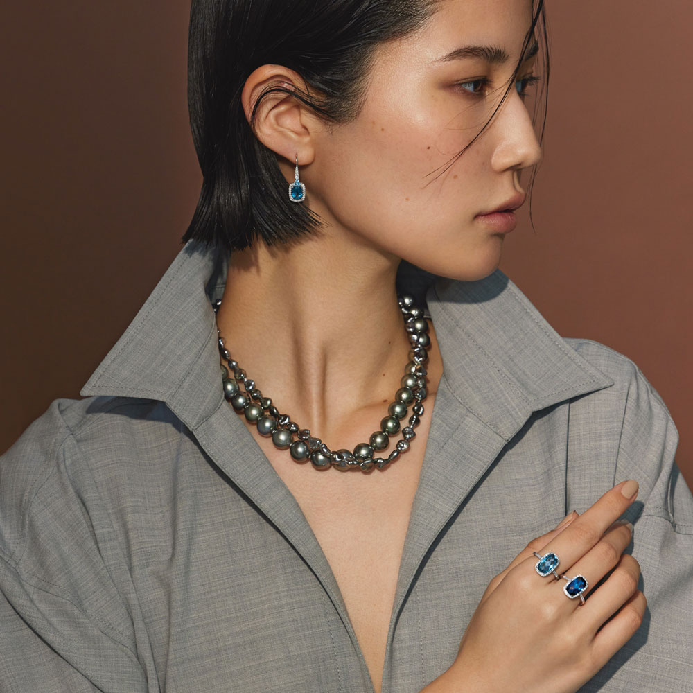 凛とした洗練を醸す黒蝶のグレーパールと、清浄な高貴さを感じさせるブルートパーズは互いを引き立て合うグッドパートナー。