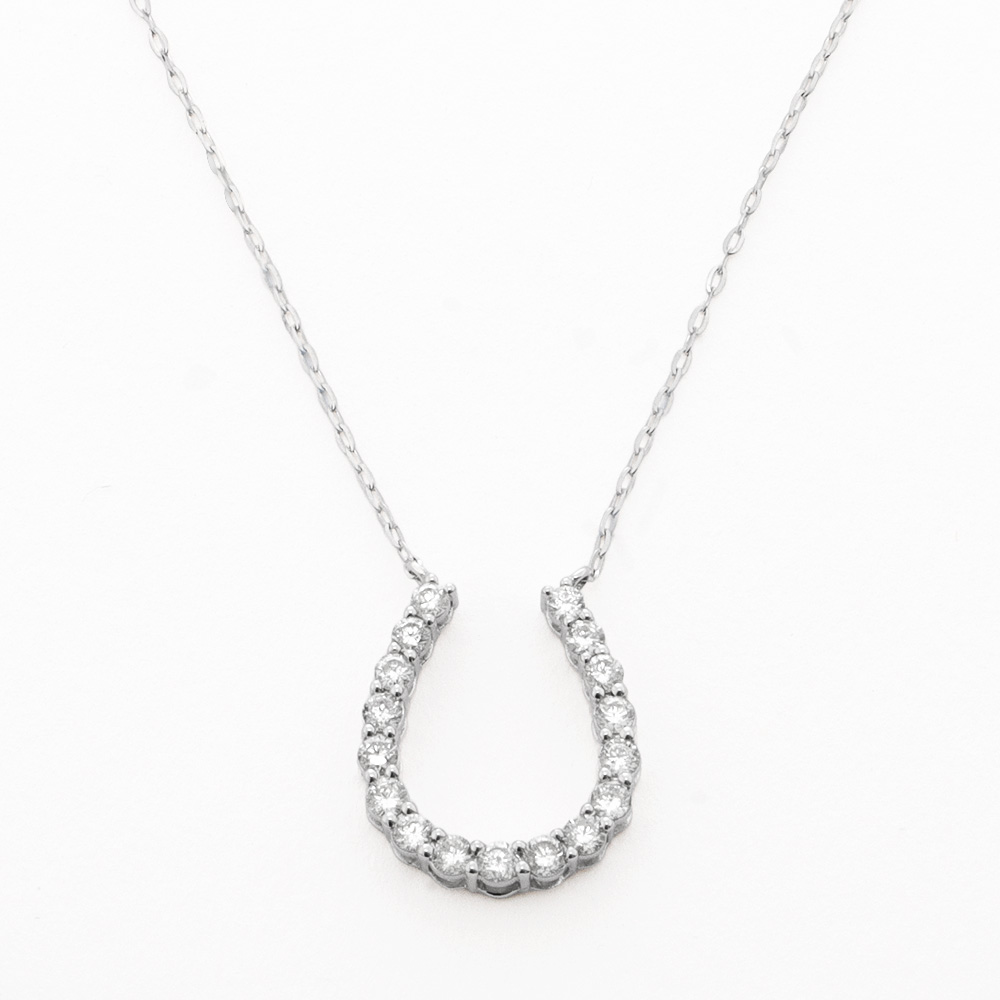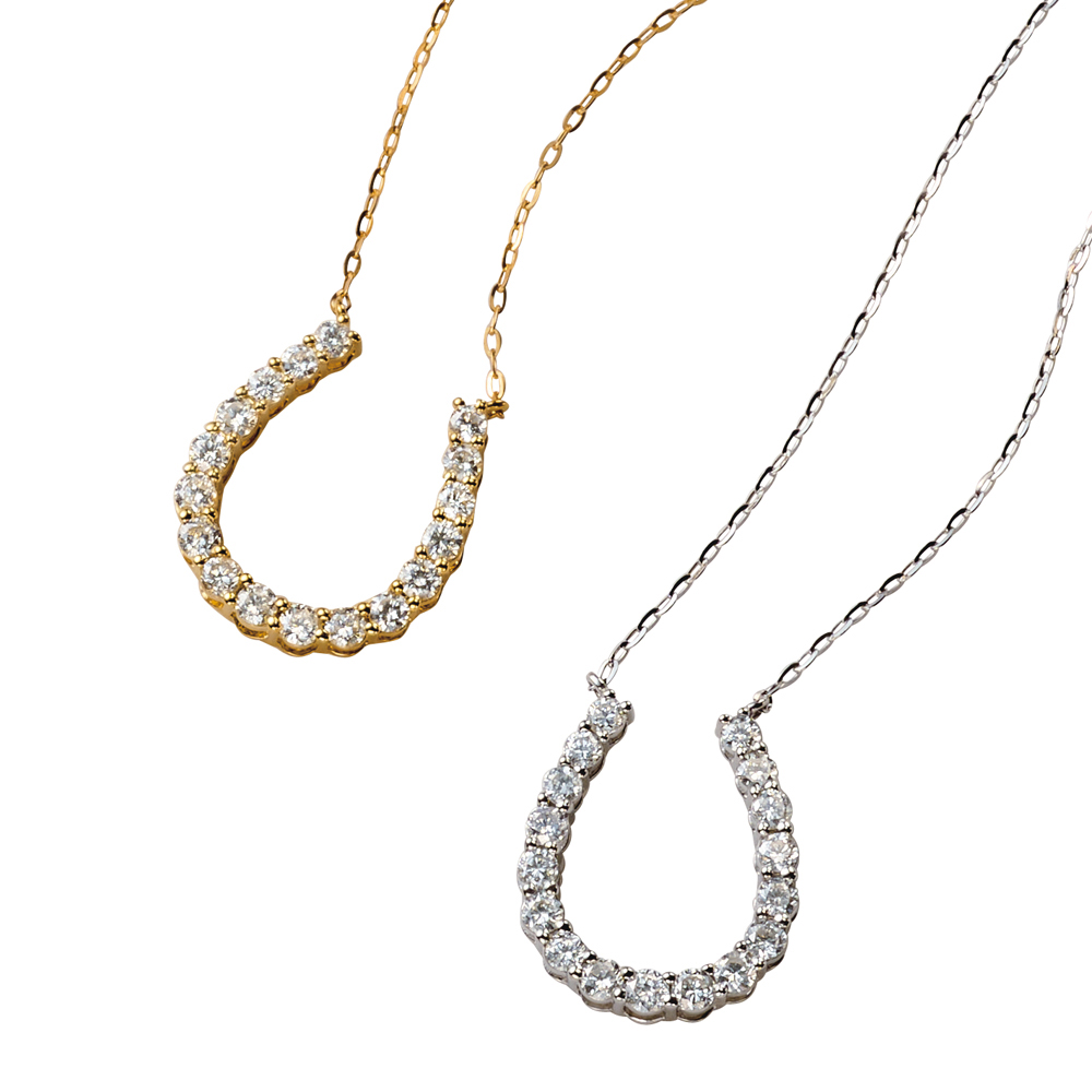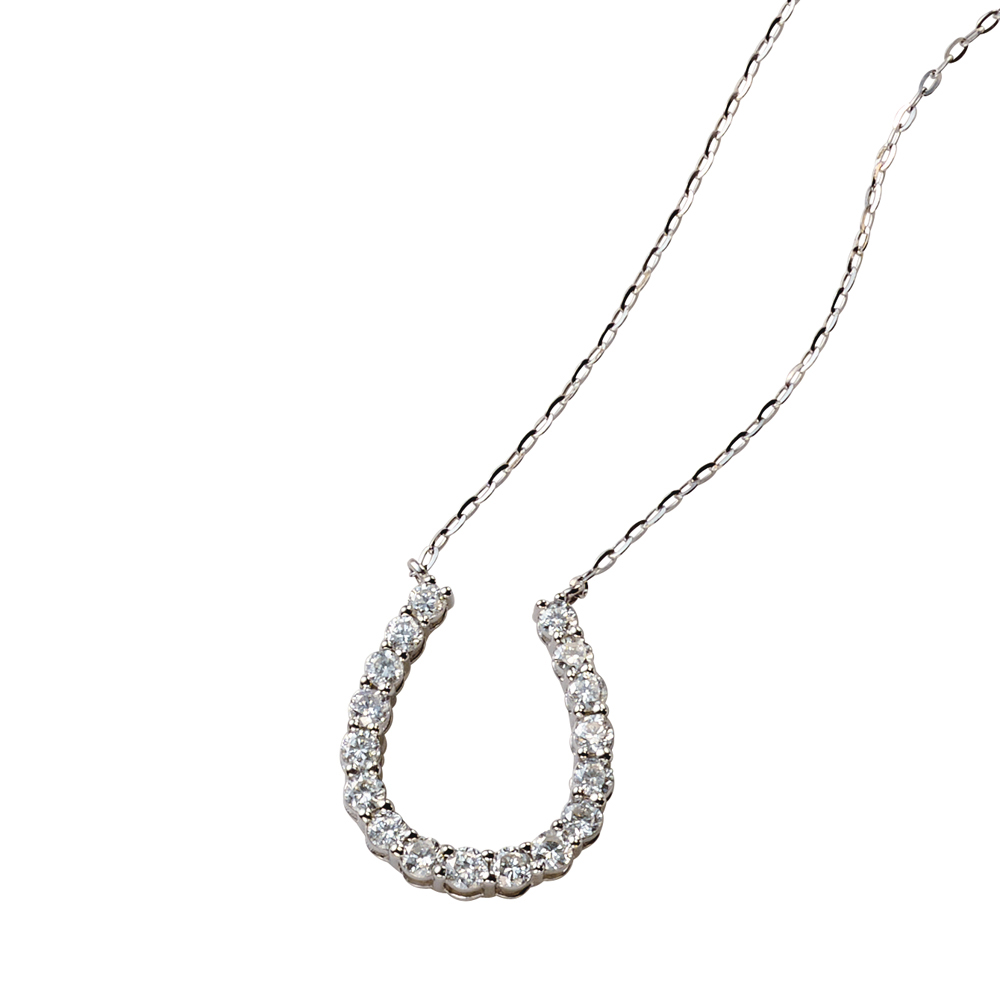ラッキーアイテムのホースシューモチーフにラウンドブリリアントカットのダイヤモンドをたっぷり0.5ct敷き詰めました。こころウキウキ、気分は最高…!アクティブなあなたにピッタリのペンダントです。