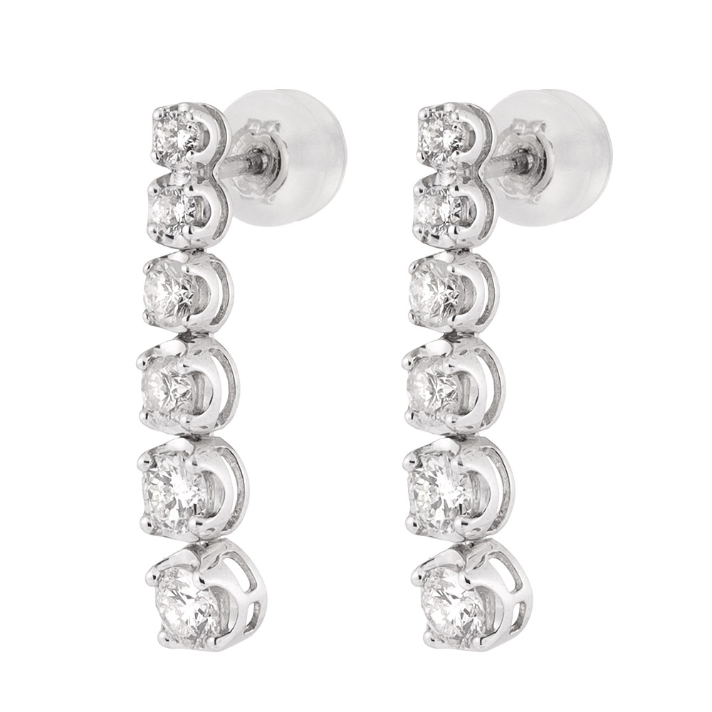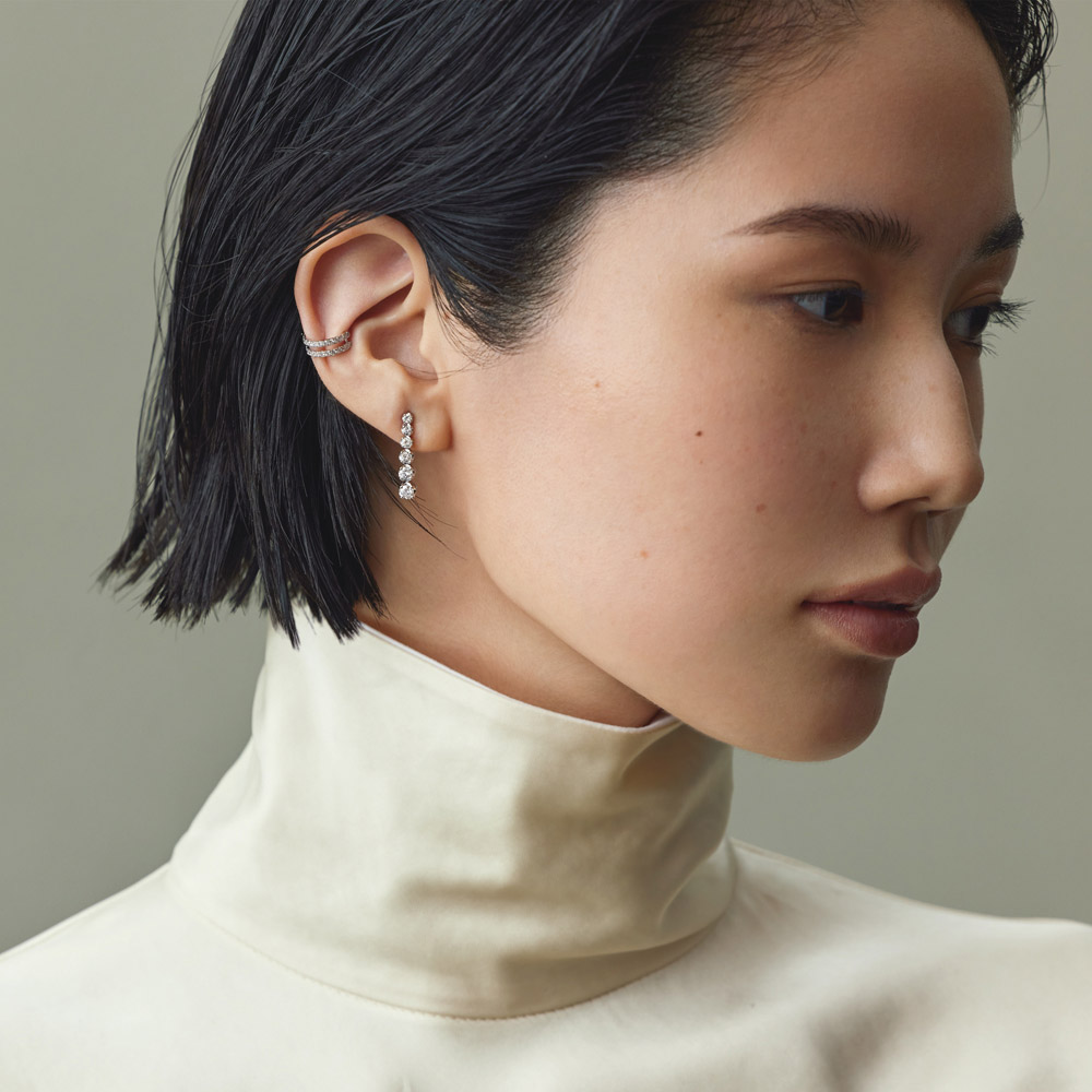 上質なダイヤがプラチナ枠に反射し、大きく煌めくグラデーションピアス。身のこなしと共に光が流れるように揺れる優雅さに、視線がくぎ付けに!