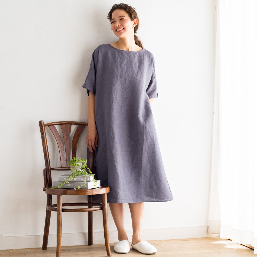 高温多湿な真夏も家時間を涼しく心地よくしてくれる、やわらかなリネン100%のワンピースです。ゆったりとした着心地で動きやすく、汗をかいてもベタつかないから家事着としても快適。リネンならではのシックな色合いも素敵です。