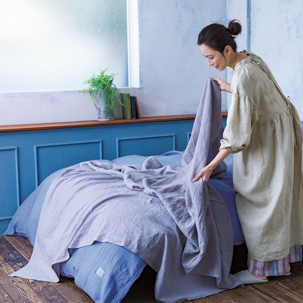 寝室でもリビングでも幅広く使えるリネンのフラットシーツ。