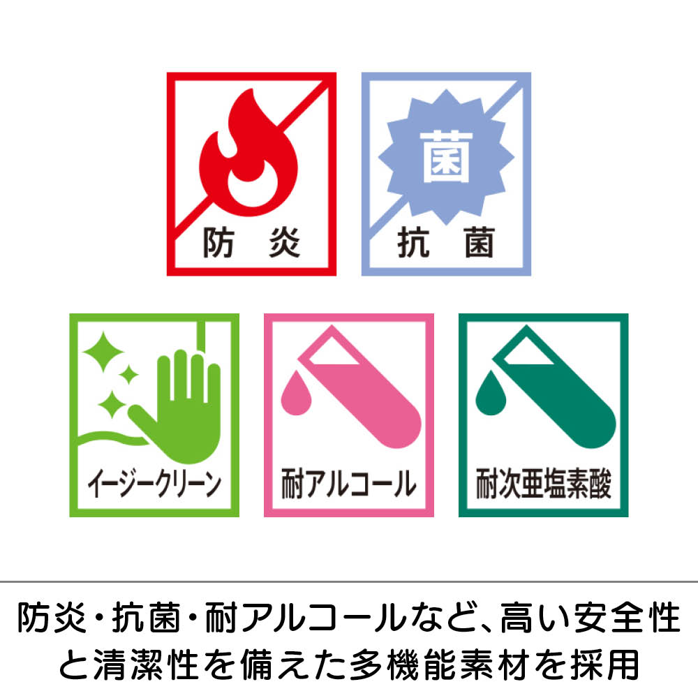 合皮素材でお手入れ簡単。水拭きはもちろん、アルコールや次亜塩素酸スプレーにも対応しているので、清潔にお使いいただけます。商品画像の説明