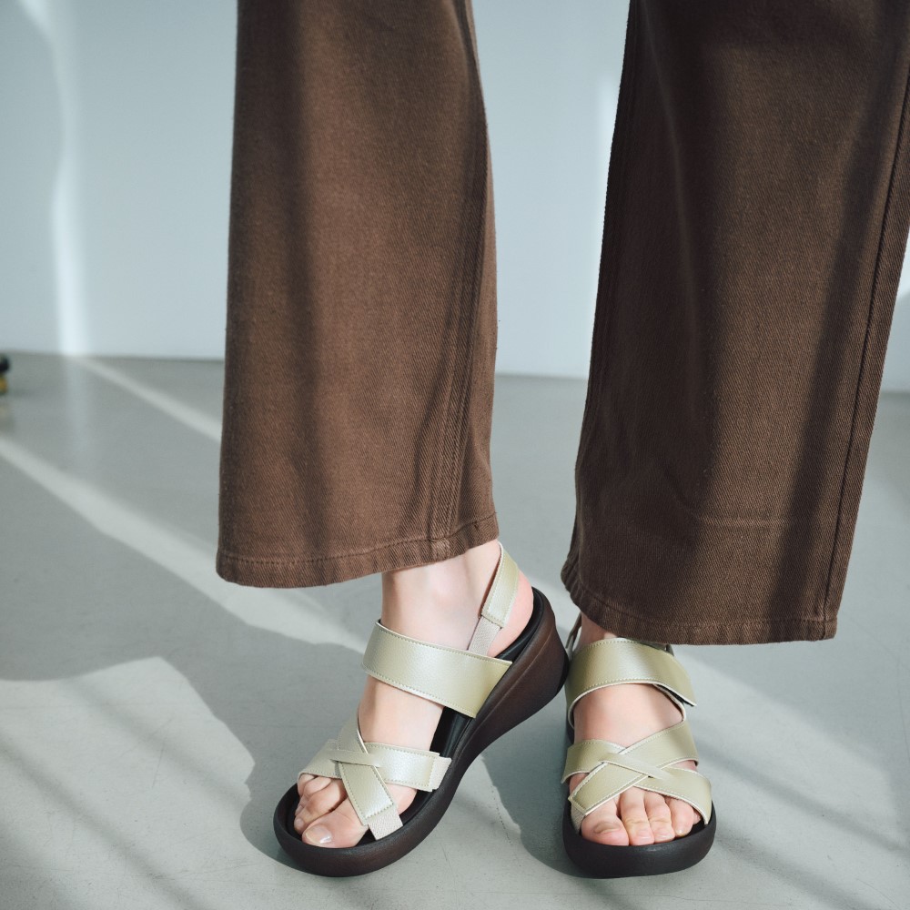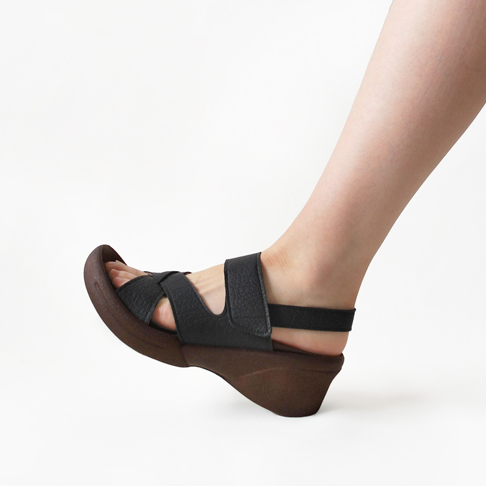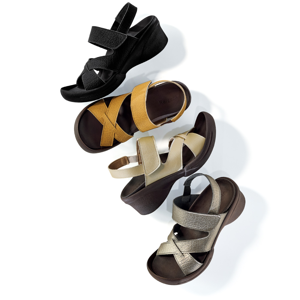【スッキリ美脚見せ&安定感】・地面との接地面が広いウェッジソールは安定した履き心地。外側にくぼみを入れて、スッキリ見え。