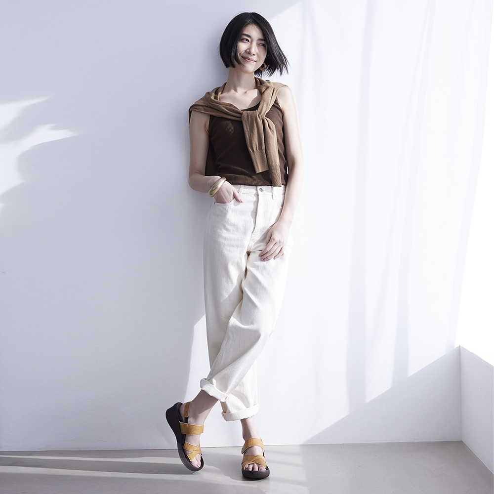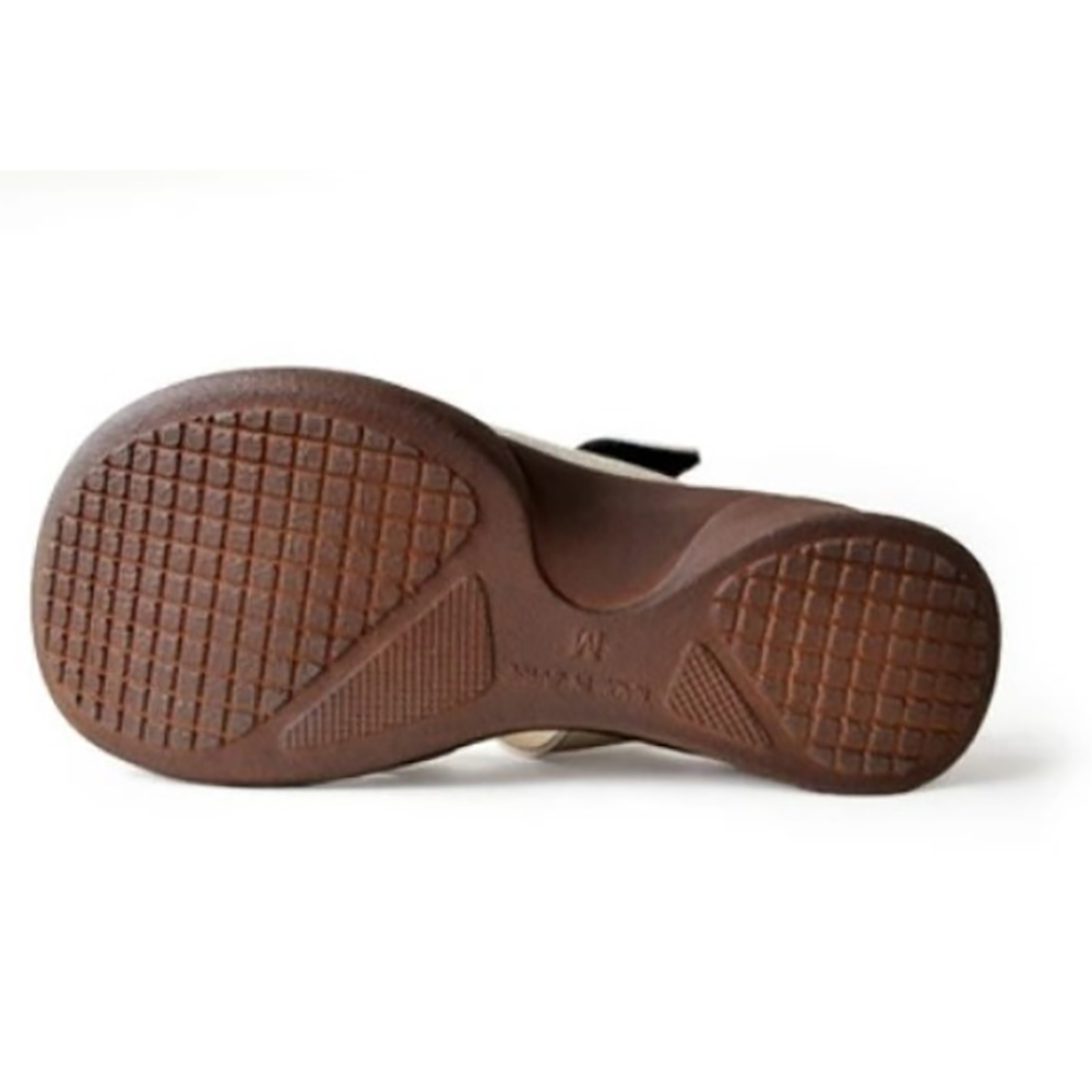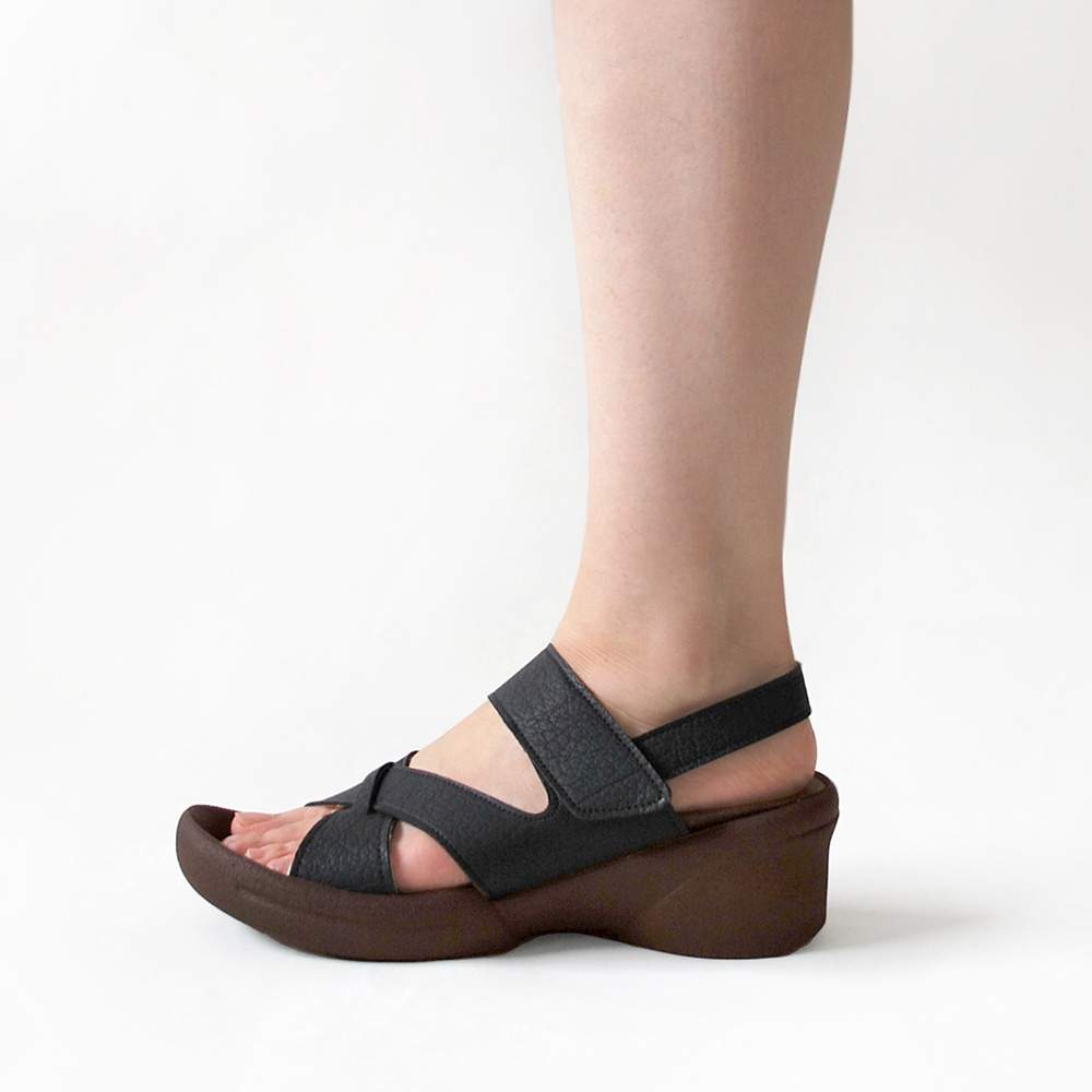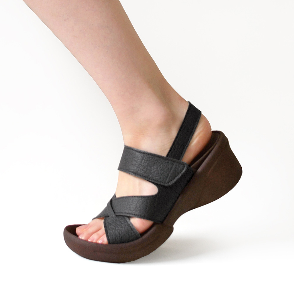 【スッキリ美脚見せ&安定感】・地面との接地面が広いウェッジソールは安定した履き心地。外側にくぼみを入れて、スッキリ見え。