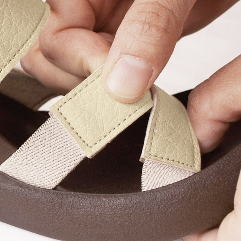 ・つま先のクロスベルト・バックベルトにはゴム切替が付いているので、しっかり固定してくれて足にフィット。