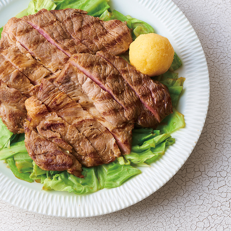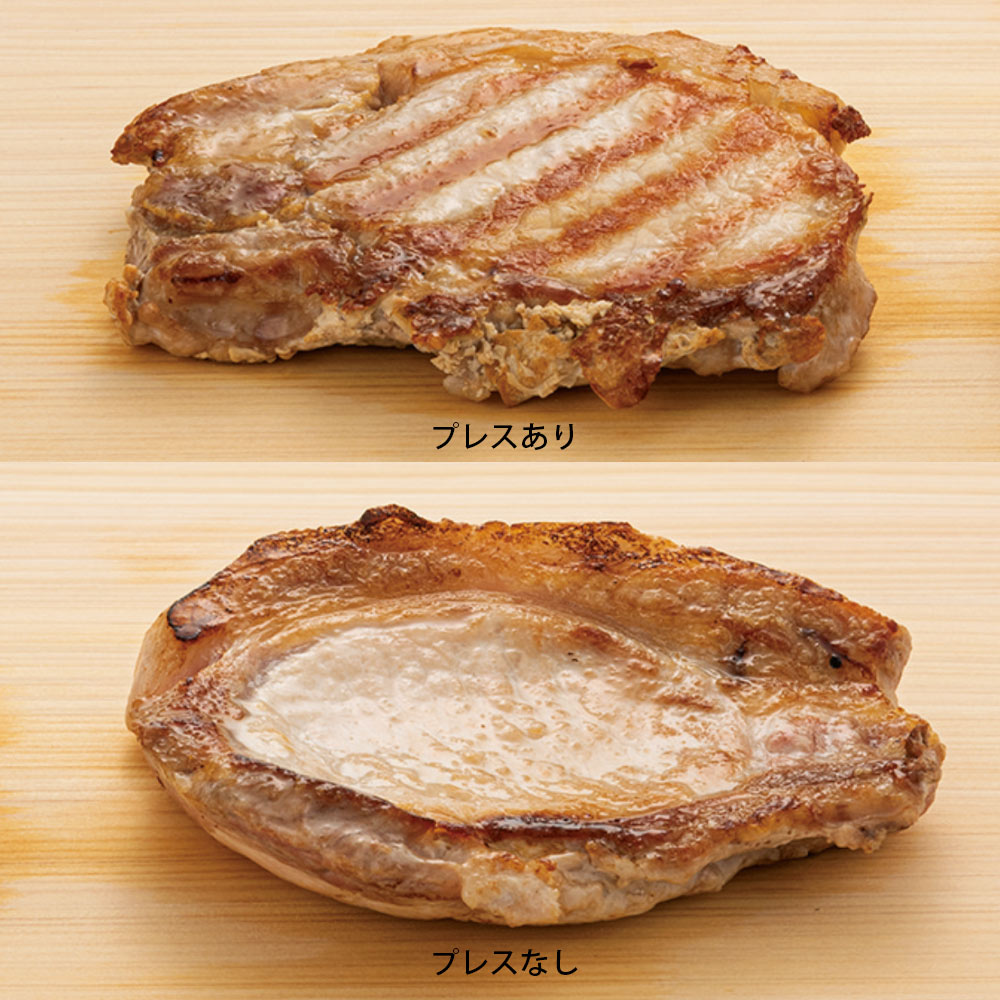 そのまま焼くと反りやすい(=火の通りにムラができる)豚の厚切りロース肉。ガラス製のグリルプレスをのせて焼けば、ご覧の焼き上がりに!