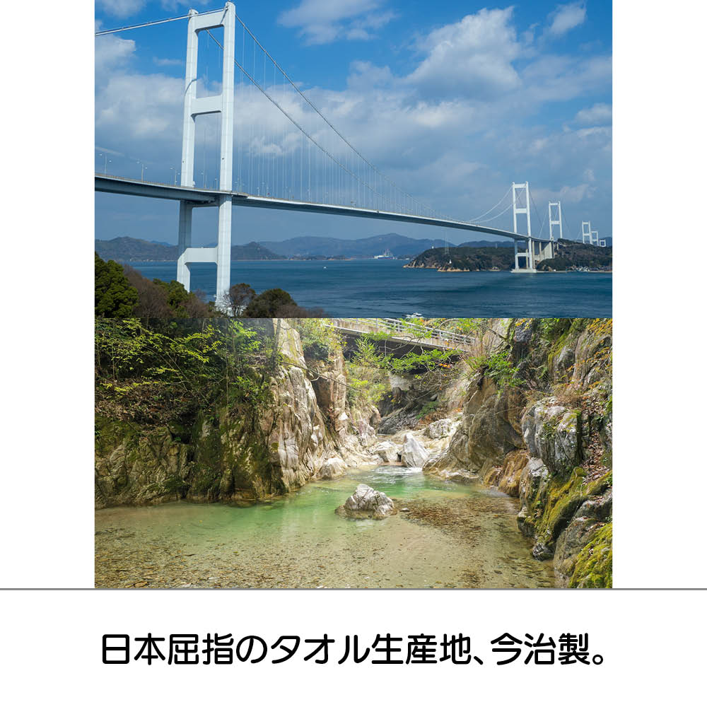 愛媛県今治市は、130年もの間タオル産業が受け継がれてきた“タオルの聖地”。この地を豊かに流れる蒼社川の伏流水はタオルづくりに適した軟水で、綿本来の柔らかさを引き出し、繊細で鮮やかな色表現を可能にします。
