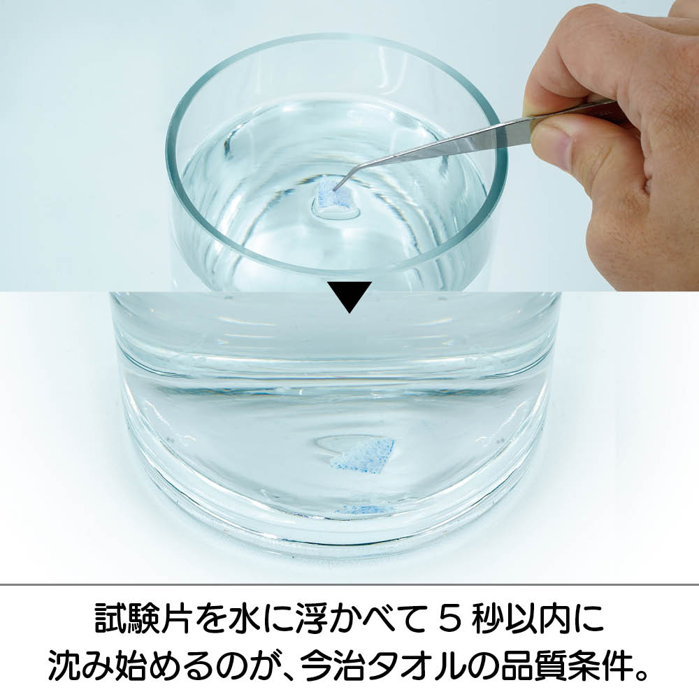 今治タオルは、産地独自の品質基準を設けています。その代表的なものが「5秒ルール」。タオル片を水に浮かべた時、5秒以内に沈み始めるのが条件です。これは、今治タオルの最大の特長である吸水性を保証するため。このような産地独自の品質基準を満たしたものだけが、「今治タオル」のブランドマークをつけることができるのです。