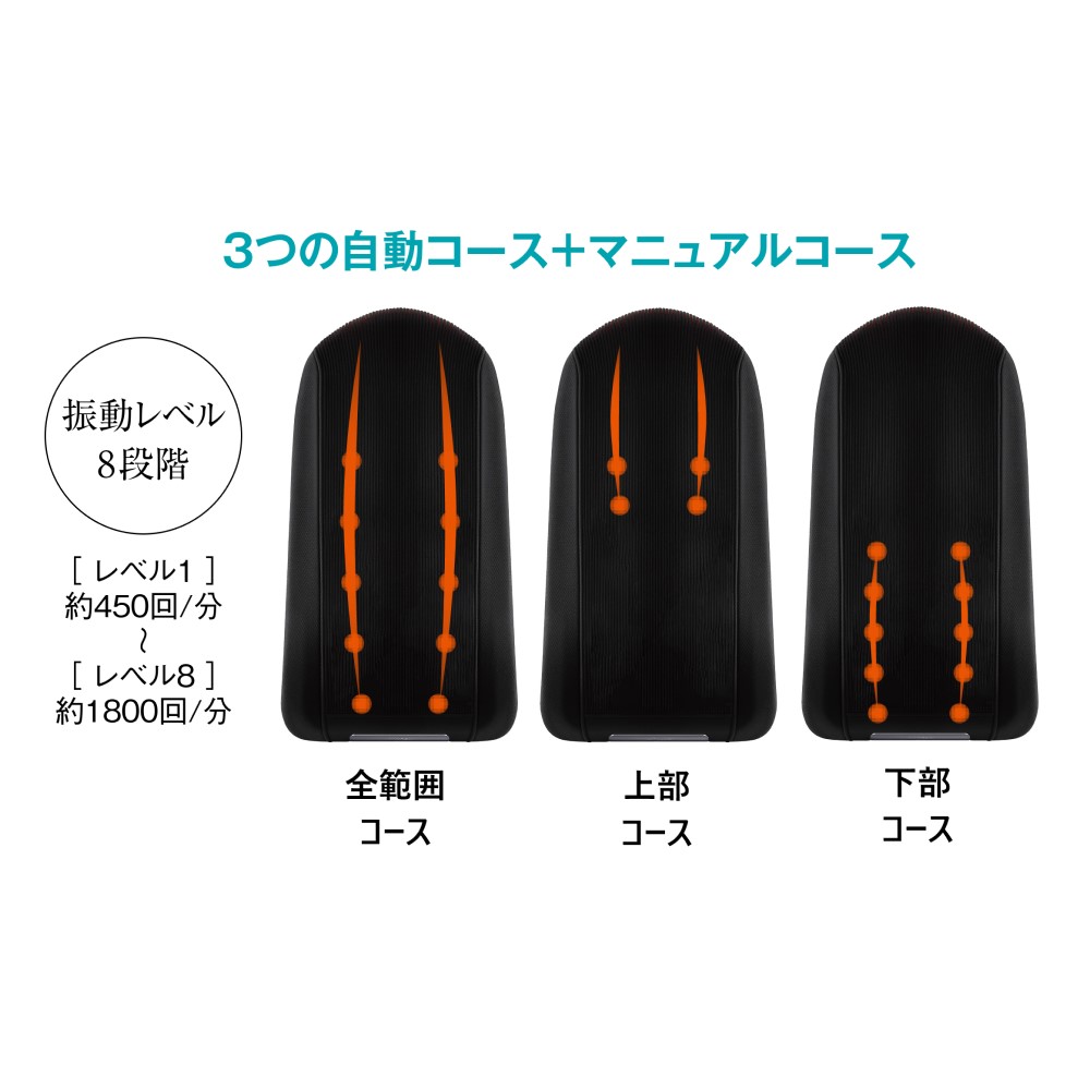 約450回/分(振動レベル1)~約1800回/分(振動レベル8)の高速振動で筋肉を刺激。パワフルに筋肉のコリをほぐします。自動コース・マニュアルコースを搭載