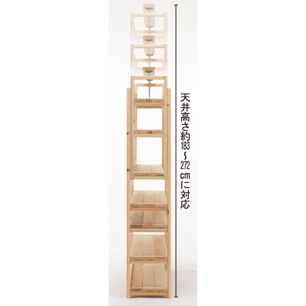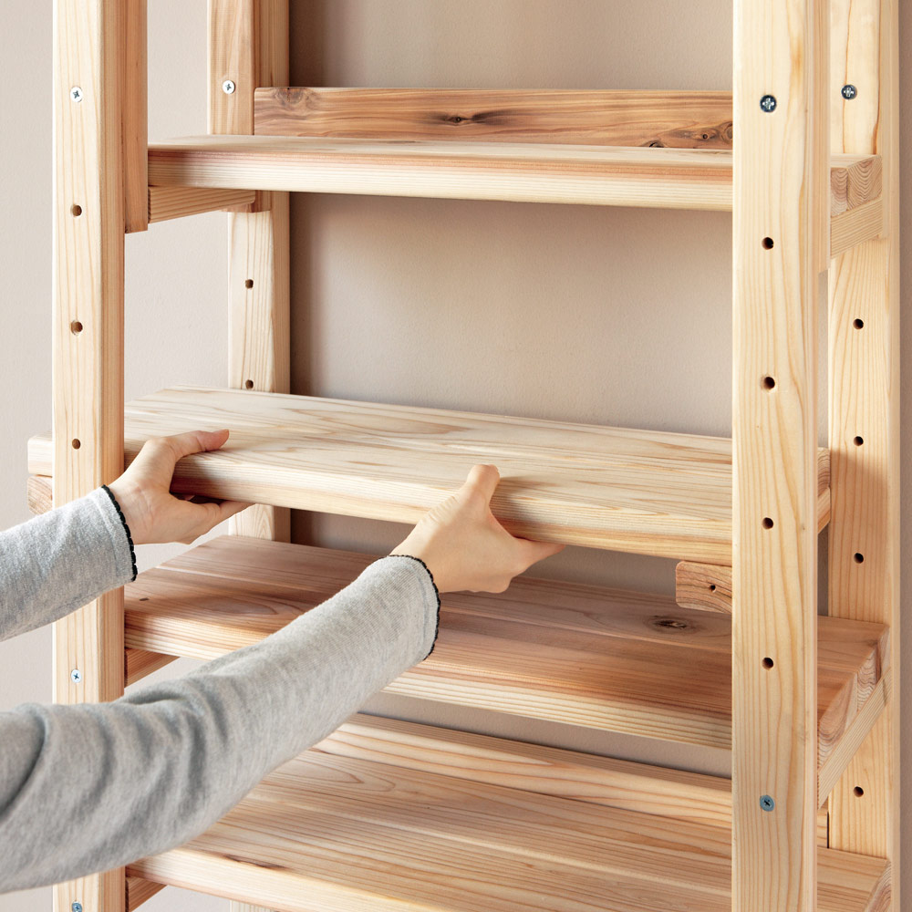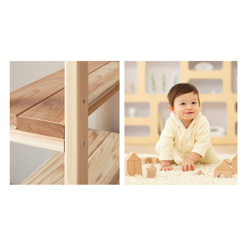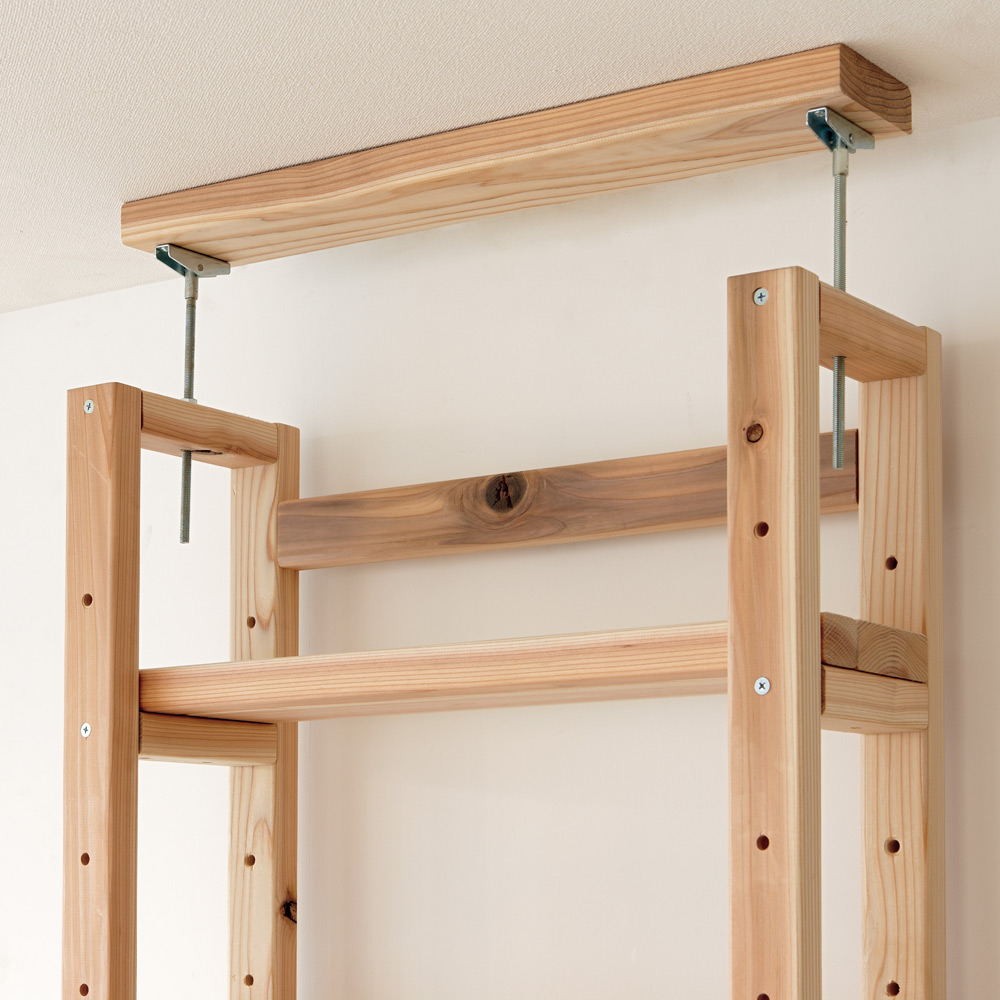 国産杉は、しっかり目の詰まった木質による丈夫さが特長。建築材にも使われているこの素材をそのまま加工しているラックは、長い年月使い続けても安心の、確かな耐久性を備えています。