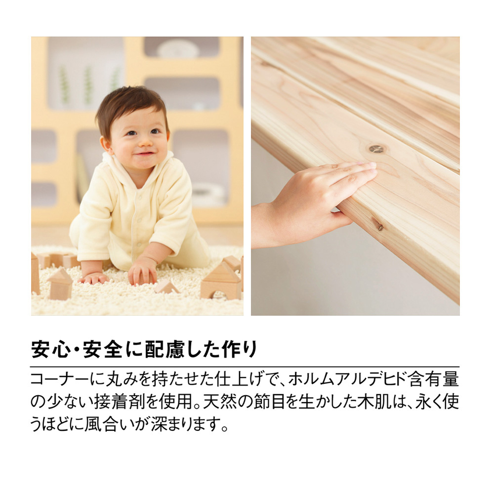 国産杉の自然な節を活かしたナチュラルな仕上げ。※節の状態によってパテ補修を施していますこと、ご了承ください。