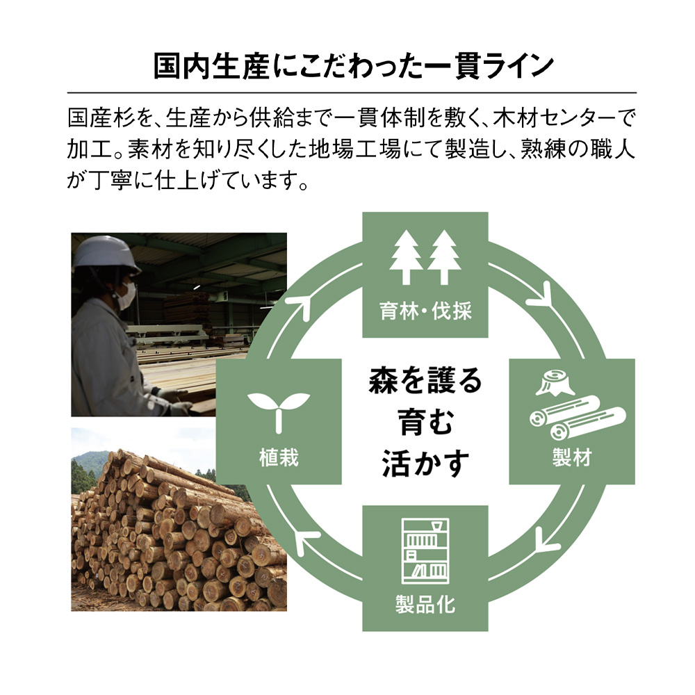 国産杉を、生産から供給まで一貫体制を敷く、木材センターの最新技術で加工。その素材を知り尽くした地場工場にて製造し、熟練の職人によって丁寧に仕上げています。