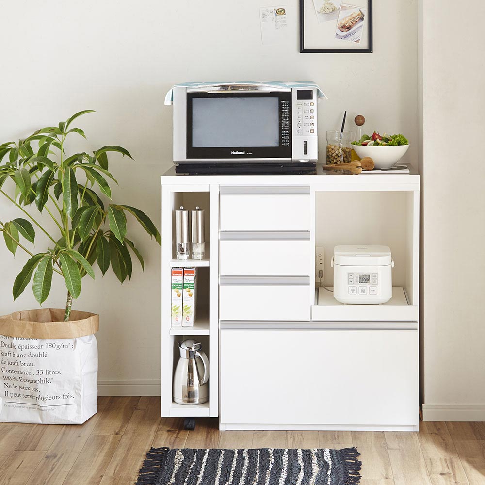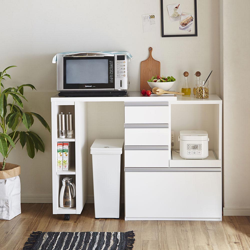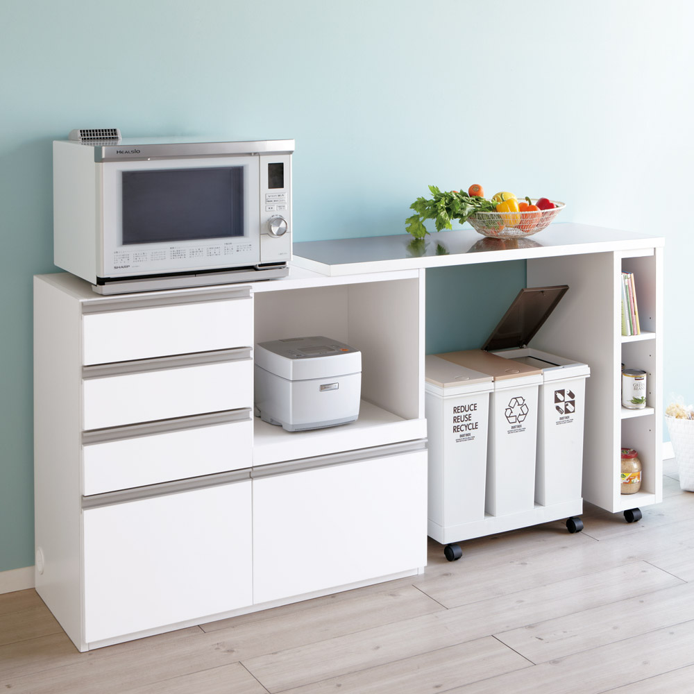 ◆レンジ、トースター、炊飯器、ホットプレートなどキッチン家電は全てまとめて収納できます。美しくある為に細部にまで配慮したおしゃれなキッチンカウンター◆(ア)ホワイトの前面には水ハネや油ハネにも強い素材を使用しています。