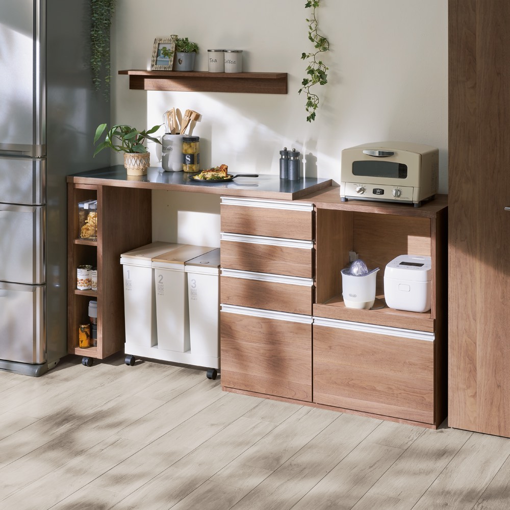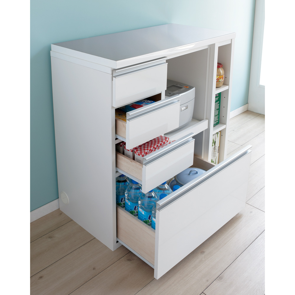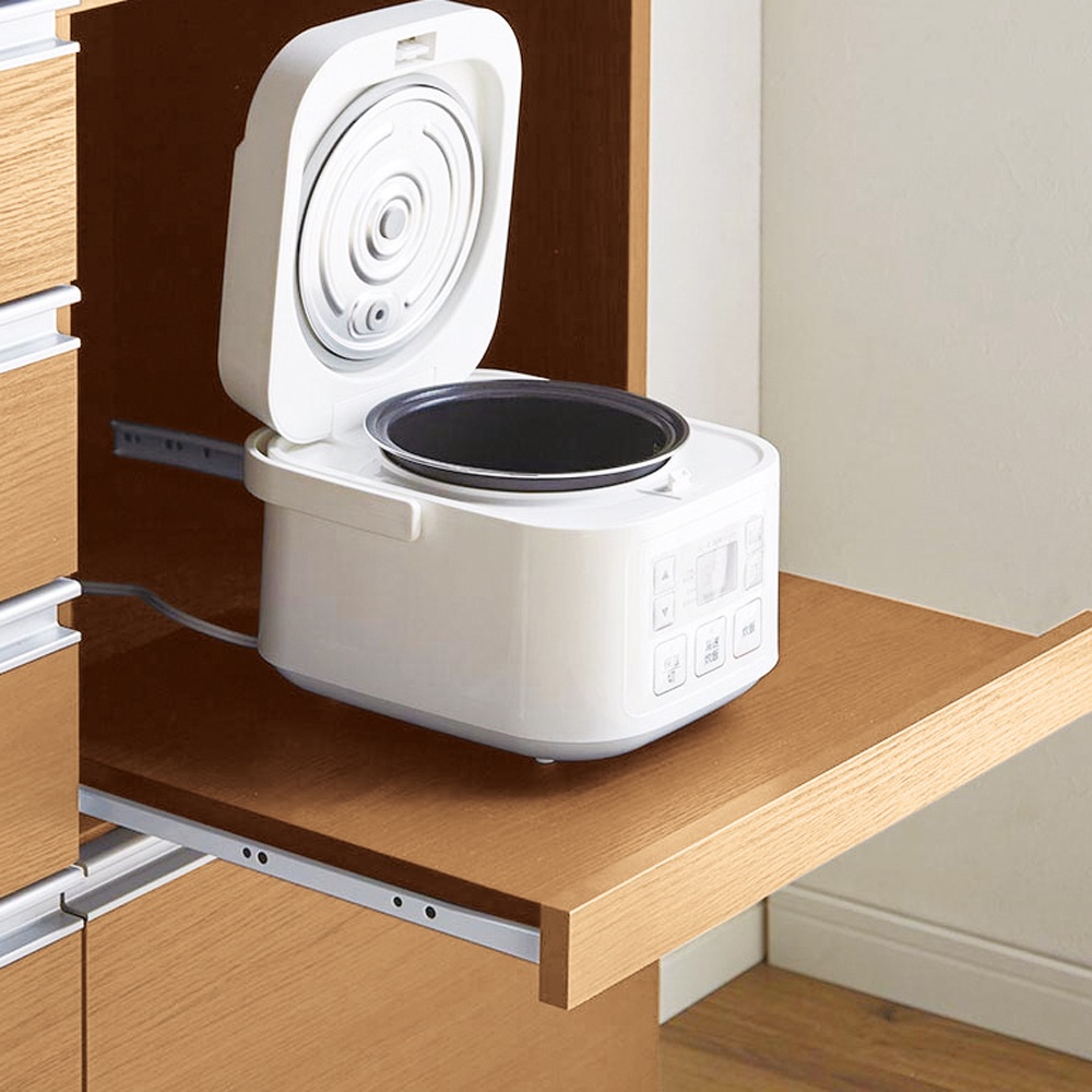 ◆すべての引き出しにストッパー付きスライドレールを装備し、滑らかに開閉できるので安心です。ほこりの溜まりやすいもたつく配線はすっきりしまう クリーンなキッチンの味方◆家電を収納する以上、配線は重要な問題です。カウンター自体が美しくとも、コードがごちゃついているようでは台無し。