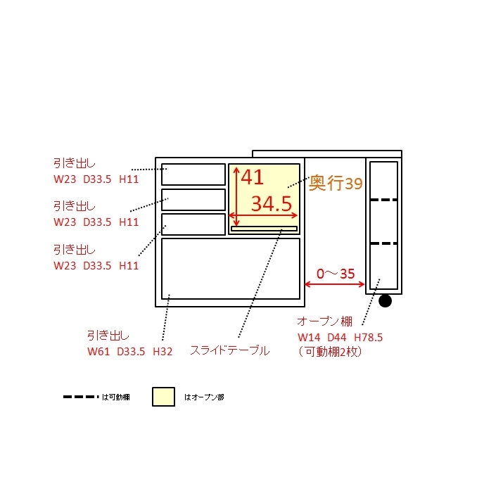 スライド部オープン収納部サイズ:幅14奥行44高さ78.5cm 可動棚式なので収納物によって高さを変えられます。