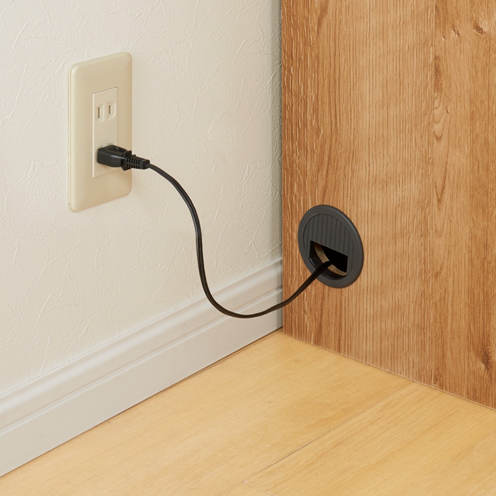 ◆配線コードを内部に通し、側面床付近に設置したコード穴から出すことで、コードを目立たせず床に這わせることが可能に。