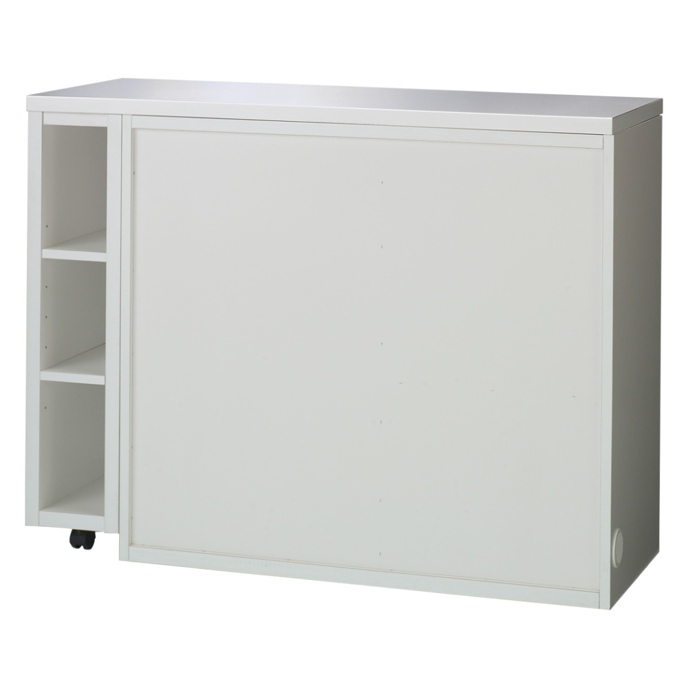 背面も化粧されているのでバーカウンターとしても使えるアイデアキッチン収納です。すき間収納いらずの幅91~126cmで使える伸長式◆天板はキャスター付きで簡単にスライドして伸長させることができるので狭いキッチンにもぴったり。