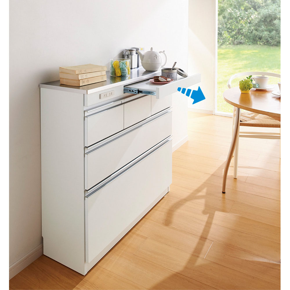 ◆料理の盛りつけやレンジ周りでの調理時に便利なスライドテーブル天板付きのレンジラック。