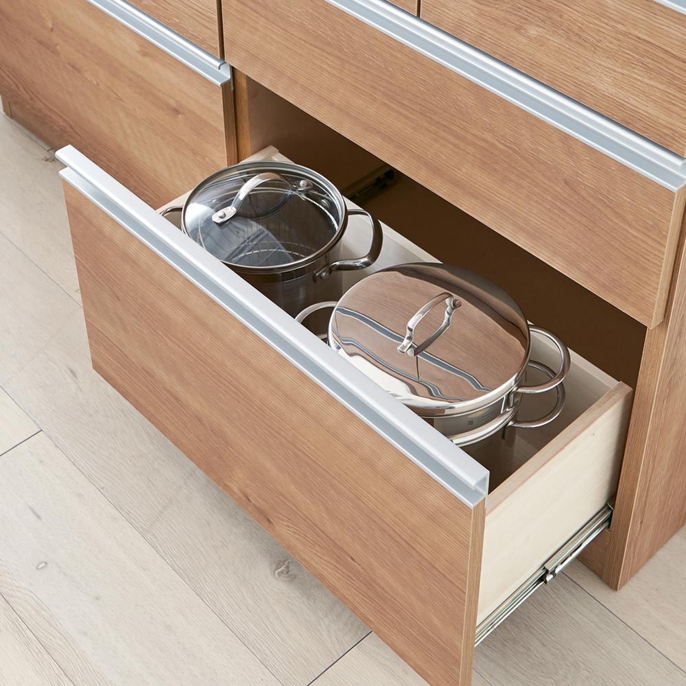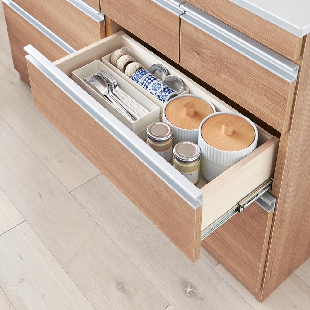 ◆下2段の引き出しは滑らかに奥まで開閉するフルスライドレールつき。