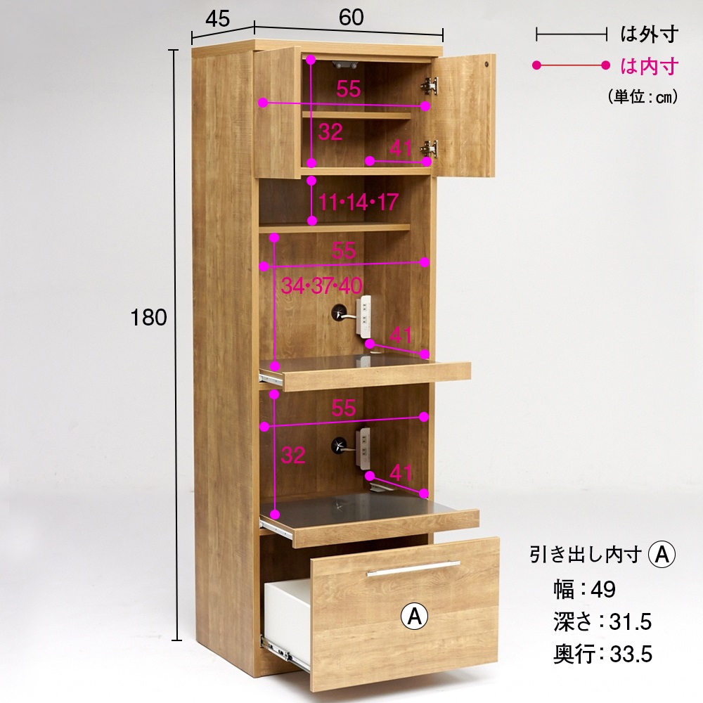 (外寸)幅60×奥行45×高さ180cm (家電収納部内寸)幅55×奥行41×高さ51/32cm