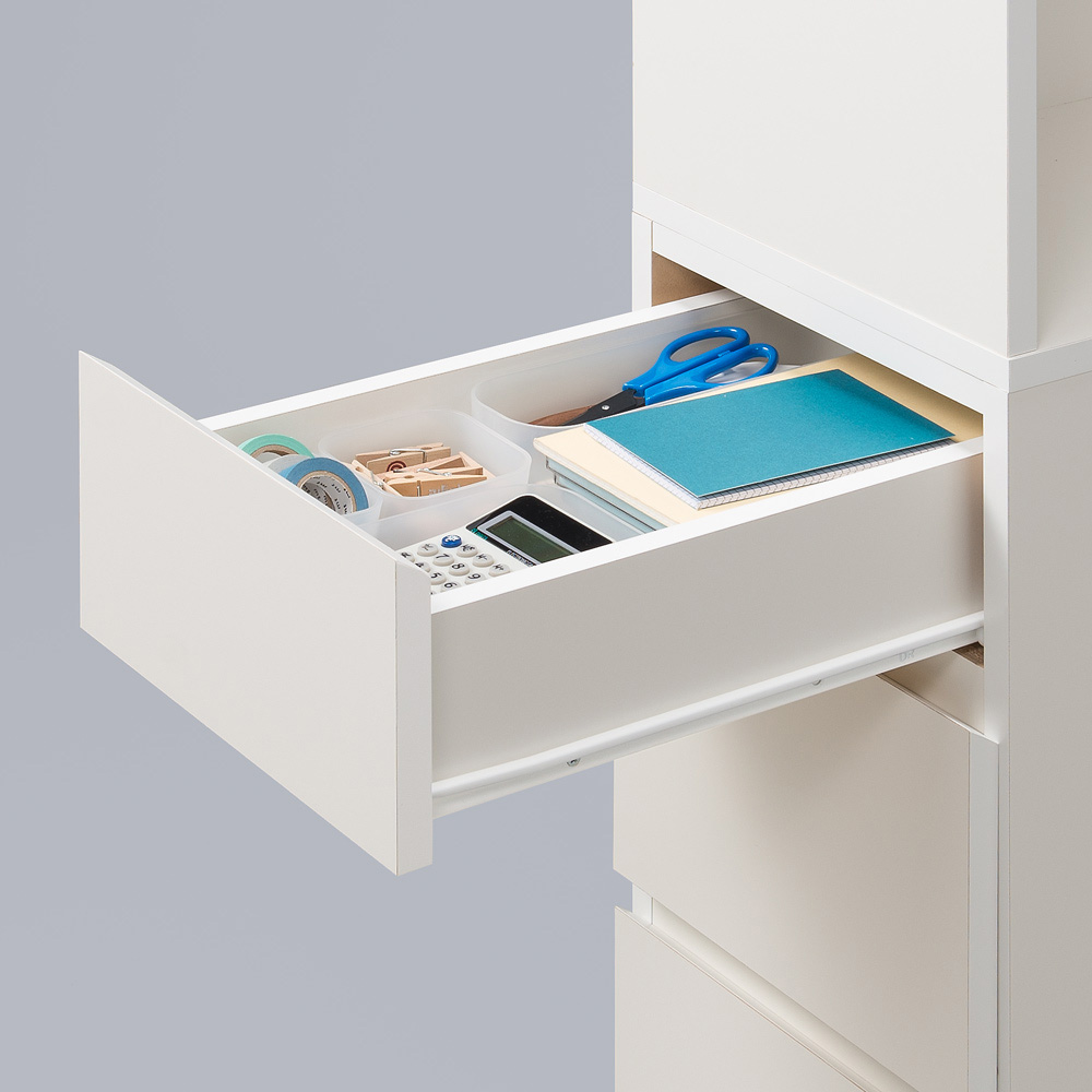 • 小サイズの引出し(1段目)は、筆記用具や文房具、メモリ・スマホの充電ケーブルなど細々したモノの収納に。スライドレールで開閉スムーズです。