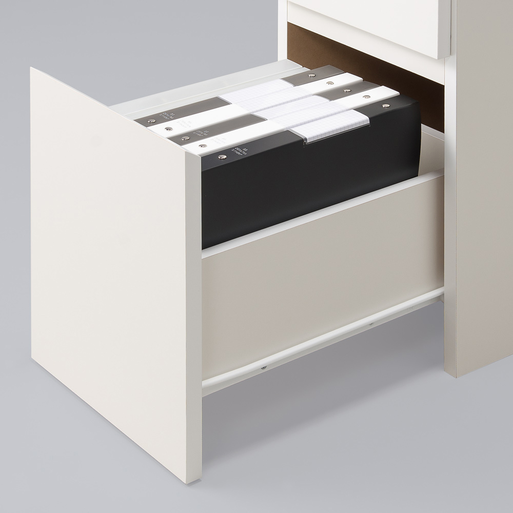 • 大サイズの引出し(3段目)は、A4ファイル対応サイズで背の高い収納物も入ります。スライドレールで開閉スムーズです。
