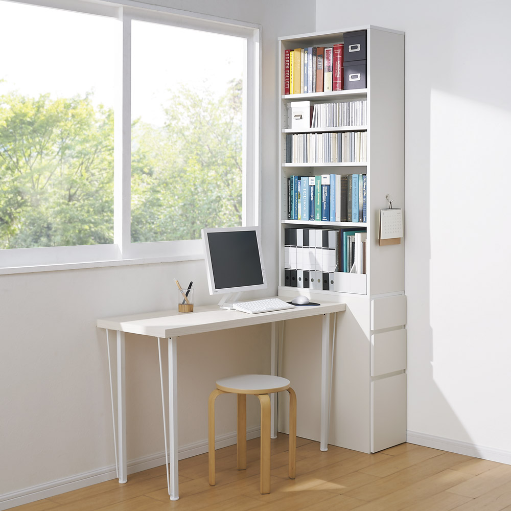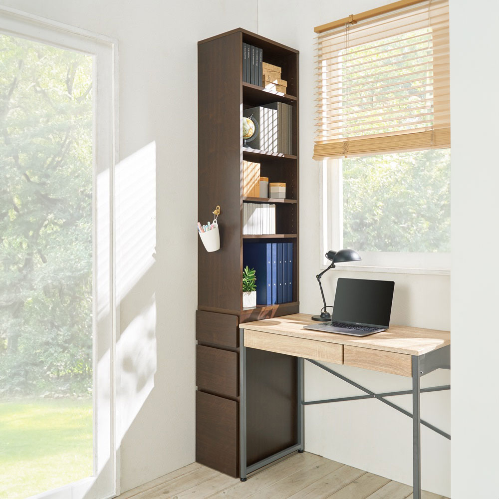 奥行は46.5cmと61.5cmをご用意。カラーはホワイト、ライトブラウン、ダークブラウンの3色展開。収納物やスペース、パソコンデスクのサイズに合わせてお選びください。