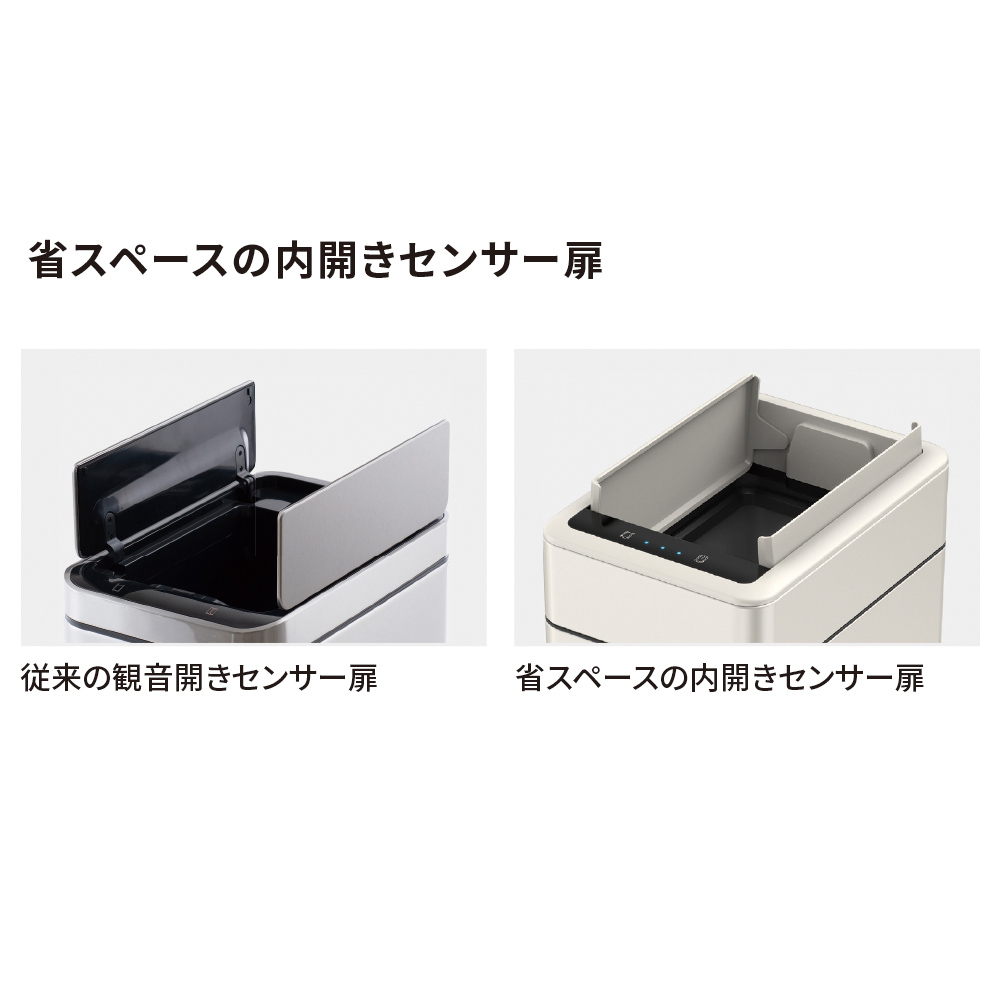 センサーで開閉する扉は内開きの観音開きタイプ。高さ制限のある場所にも置きやすい設計です。※センサーは上部約25cmまで感知します。棚下25cm確保できない場合は、センサー部分だけ前に出す等ご調整ください。