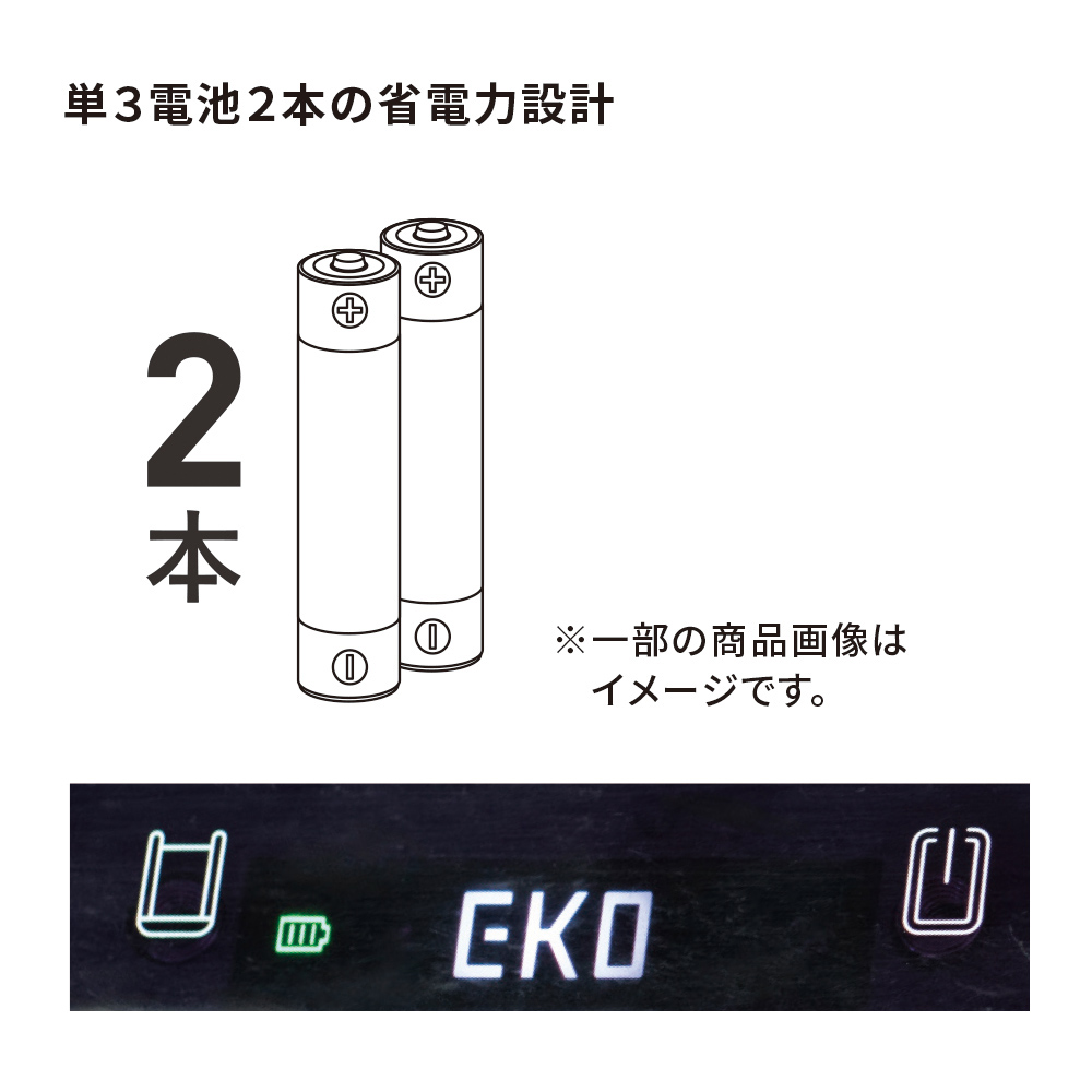 電池は単3電池2本でOK。4本必要だった従来品と比べて半分になり、経済的になりました。電池の残量が少なくなると、インジケーターが赤く点灯してお知らせしてくれます。商品画像の説明
