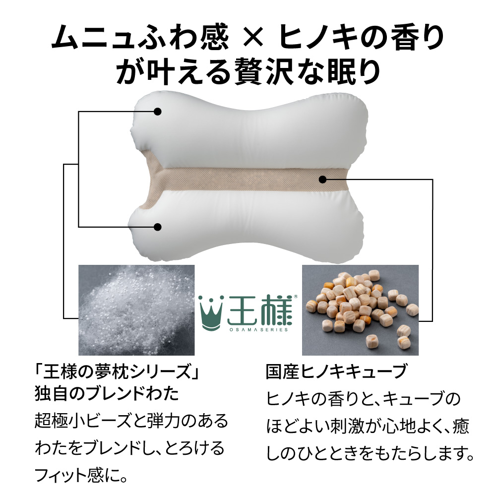 ムニュふわ感×ヒノキの香りが叶える贅沢な眠り独自ブレンドわたが奏でるムニュふわタッチと、枕中央に配した国産ヒノキチップの香りと感触が相まって、横になった瞬間から癒しの時間が始まります。「王様の夢枕シリーズ」が持つ20年以上の眠りの知恵を借り、「穏やかで自由な眠りを叶えてほしい」という想いをこめて作ったとっておきの枕です。