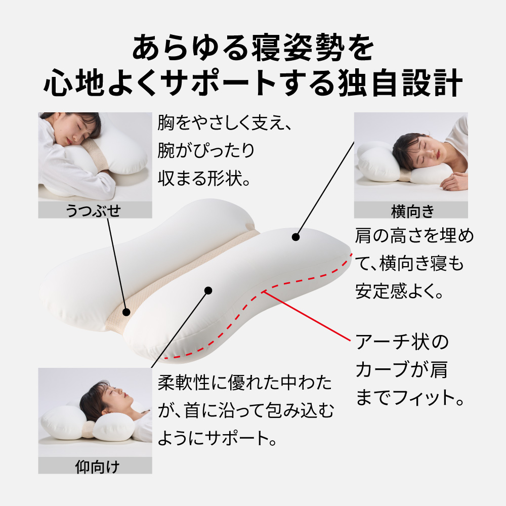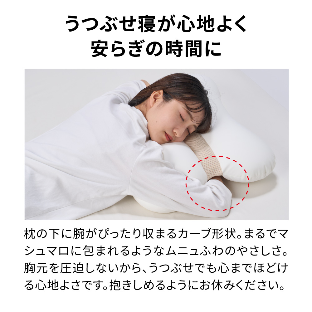 うつぶせ寝が心地よく安らぎの時間にうつぶせ寝が好きだけど「胸が圧迫されたり、腕の置き場所に困って続かない」という経験ありませんか?この枕ならムニュふわの感触が胸部をやさしく安定感よくサポート。さらに独自のくびれた形状で腕まで支え、自然に脱力しやすい寝姿勢に。快適なうつぶせ寝が続きます。