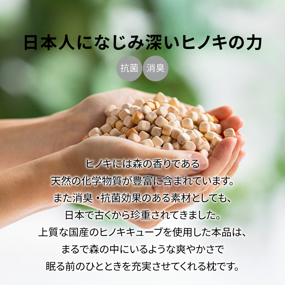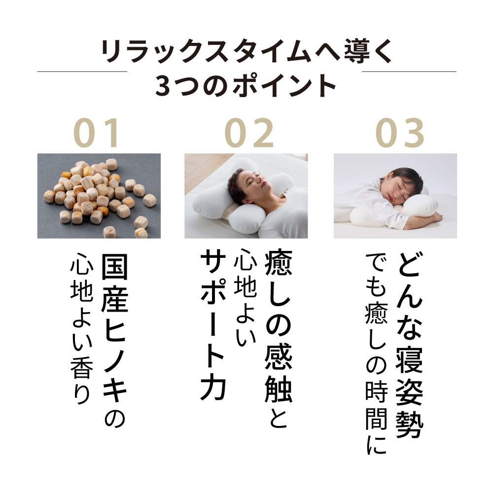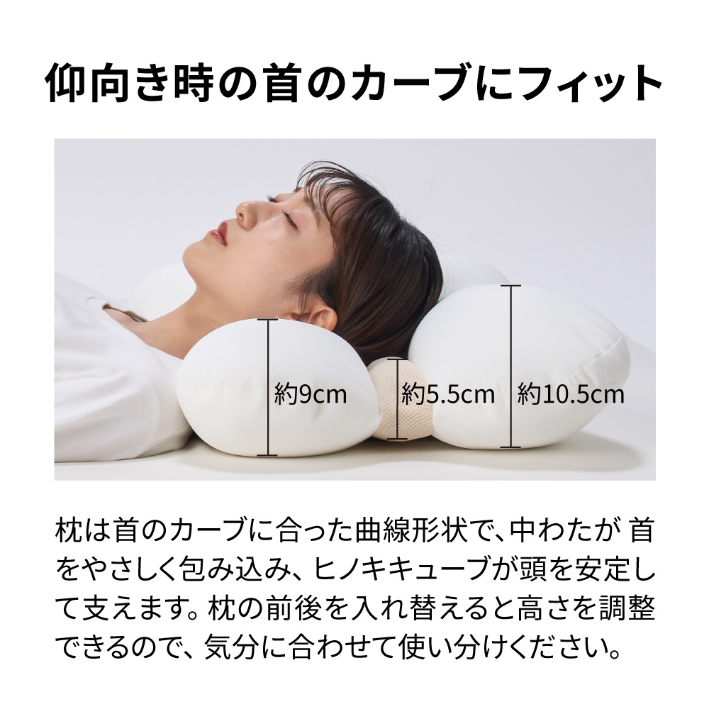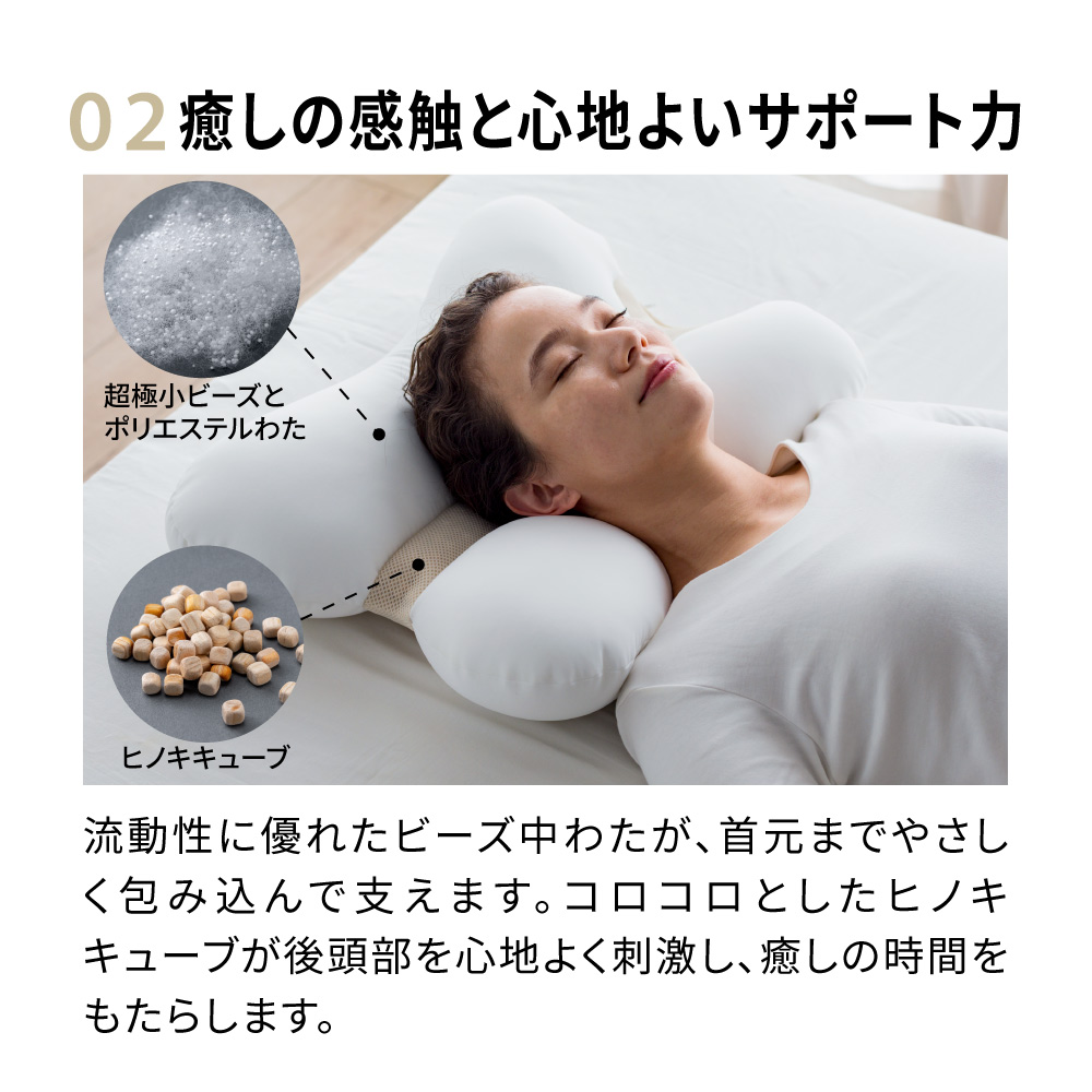 やさしいフィット感×ほどよい刺激のマリアージュやさしく包み込みながら支えてくれるビーズの中わたと、ほどよい刺激が気持ちいいコロコロとしたヒノキキューブ、異なる感触のマリアージュが奏でるやみつきの使い心地で、毎晩の眠りが癒しのひとときに。