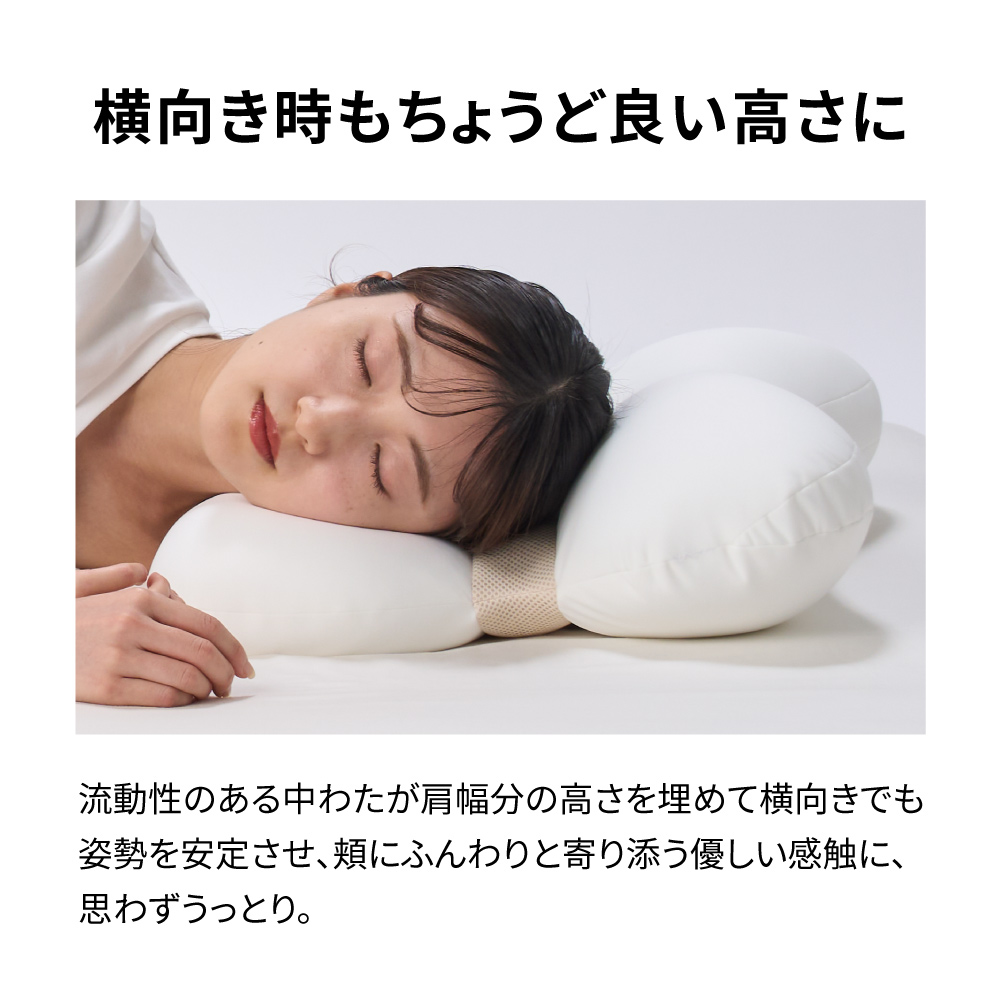 横向きの頬を優しく支え、安定した寝姿勢に流動性のある中わたが肩幅分の高さを埋めて、横向き寝も安定してサポート。「もっちりやわらかな感触」でやさしく頬や耳を包み込んでくれます。