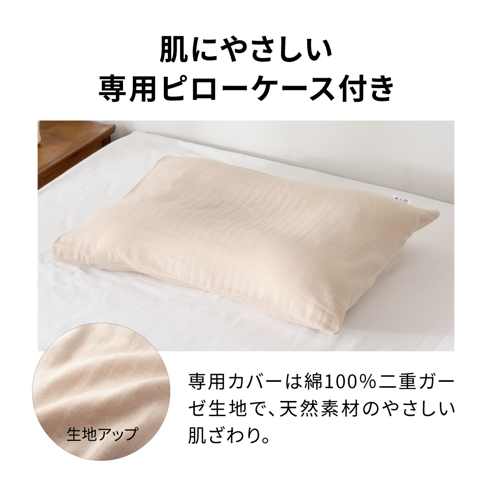 天然素材のやさしい肌ざわり 綿100%のピローケース付き専用カバーは綿100%二重ガーゼ生地で、天然素材のやさしい肌ざわり。枕の使い心地をよりいっそう引き立てます。着脱しやすいかぶせ式でお手入れも簡単。
