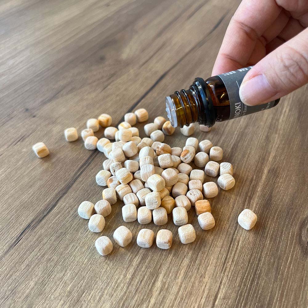 枕のヒノキキューブの香りが弱くなったと感じたら、お好みに応じて数滴たらすと、再び心地良い香りに包まれます。