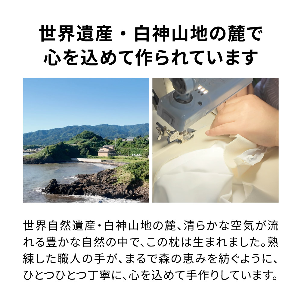 世界遺産・白神山地の麓で心を込めて作られています世界自然遺産・白神山地の麓、清らかな空気が流れる豊かな自然の中で、この枕は生まれました。熱練した職人の手が、まるで森の恵みを紡ぐように、ひとつひとつ丁寧に心を込めて手作りしています。