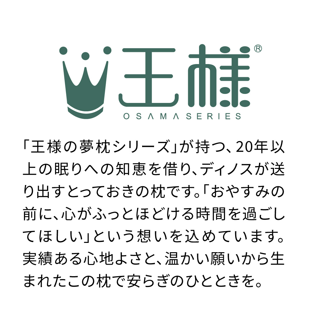 「王様の夢枕シリーズ」の20年以上の眠りへの知恵を借り、「穏やかで自由な眠りを叶えてほしい」という想いをこめて作ったとっておきの枕です。