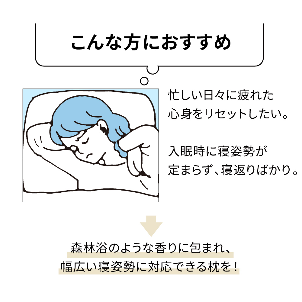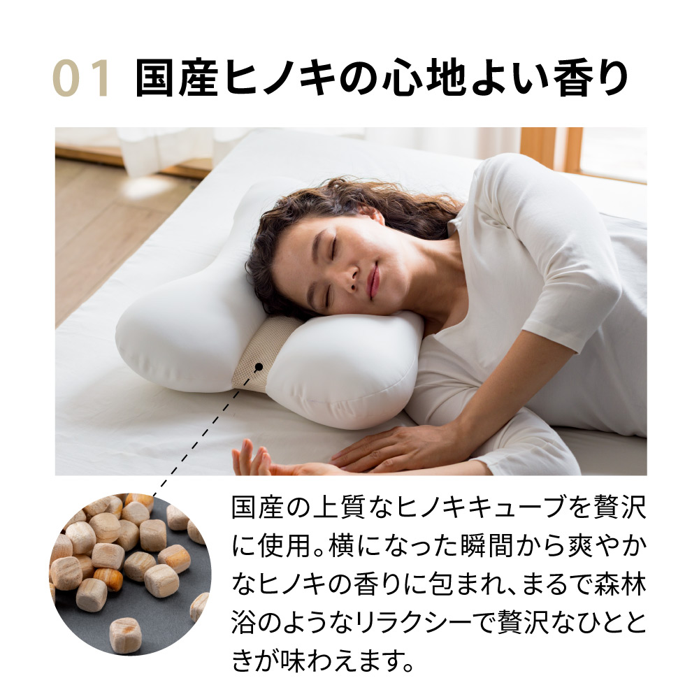 森の中で深呼吸するように、穏やかで自由な眠りを日中の忙しさや考えごとが夜まで尾を引いて、横になってもなかなか寝つけないという経験はありませんか?日々がんばっている多くの方が、せめて眠るときには身も心もリラックスできますように。そんな想いから生まれたこの枕は、心やすらぐムニュふわの感触とすがすがしい国産ヒノキの香りで入眠前のひとときに寄り添います。