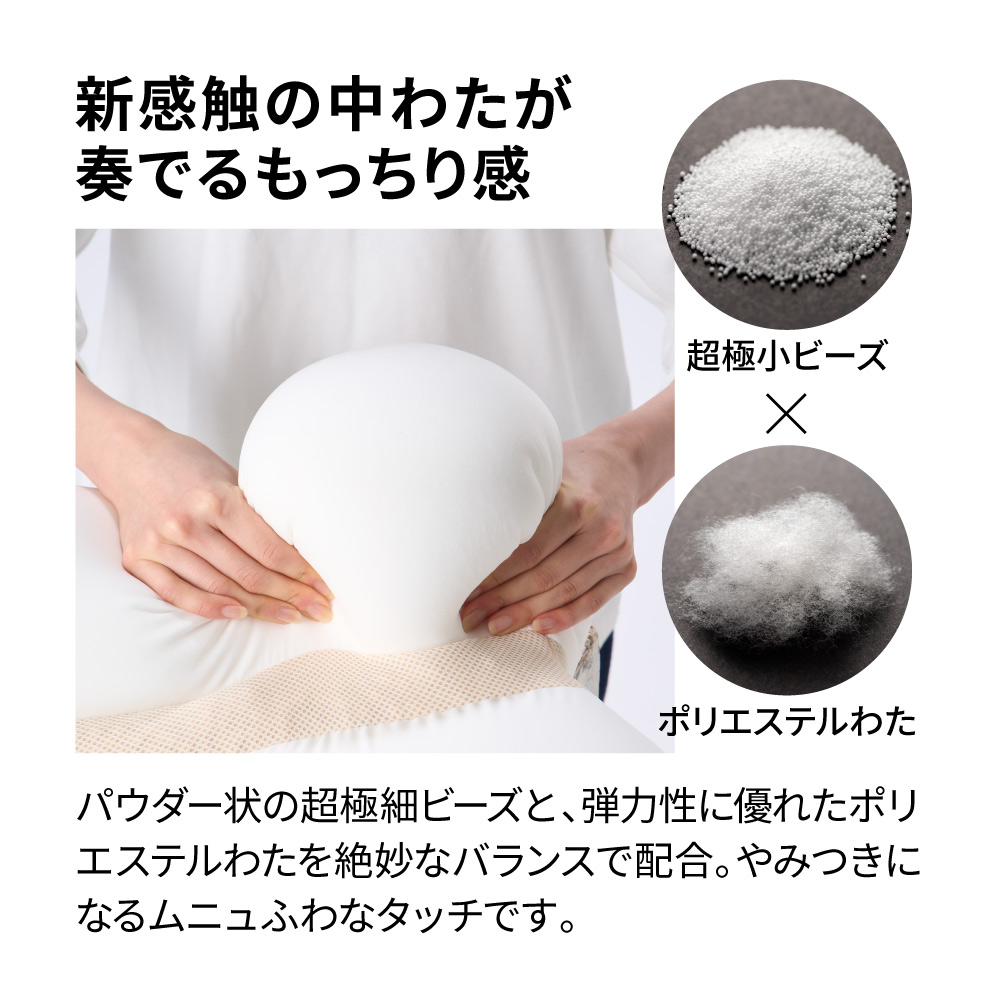 新感触の中わたが奏でるもっちり感パウダー状の超極細ビーズと弾力性に優れたわたを絶妙なバランスで配合。身体をしっかり押し返す弾力と包み込むようなやわらかさを兼ね備えた、新感覚の枕です。