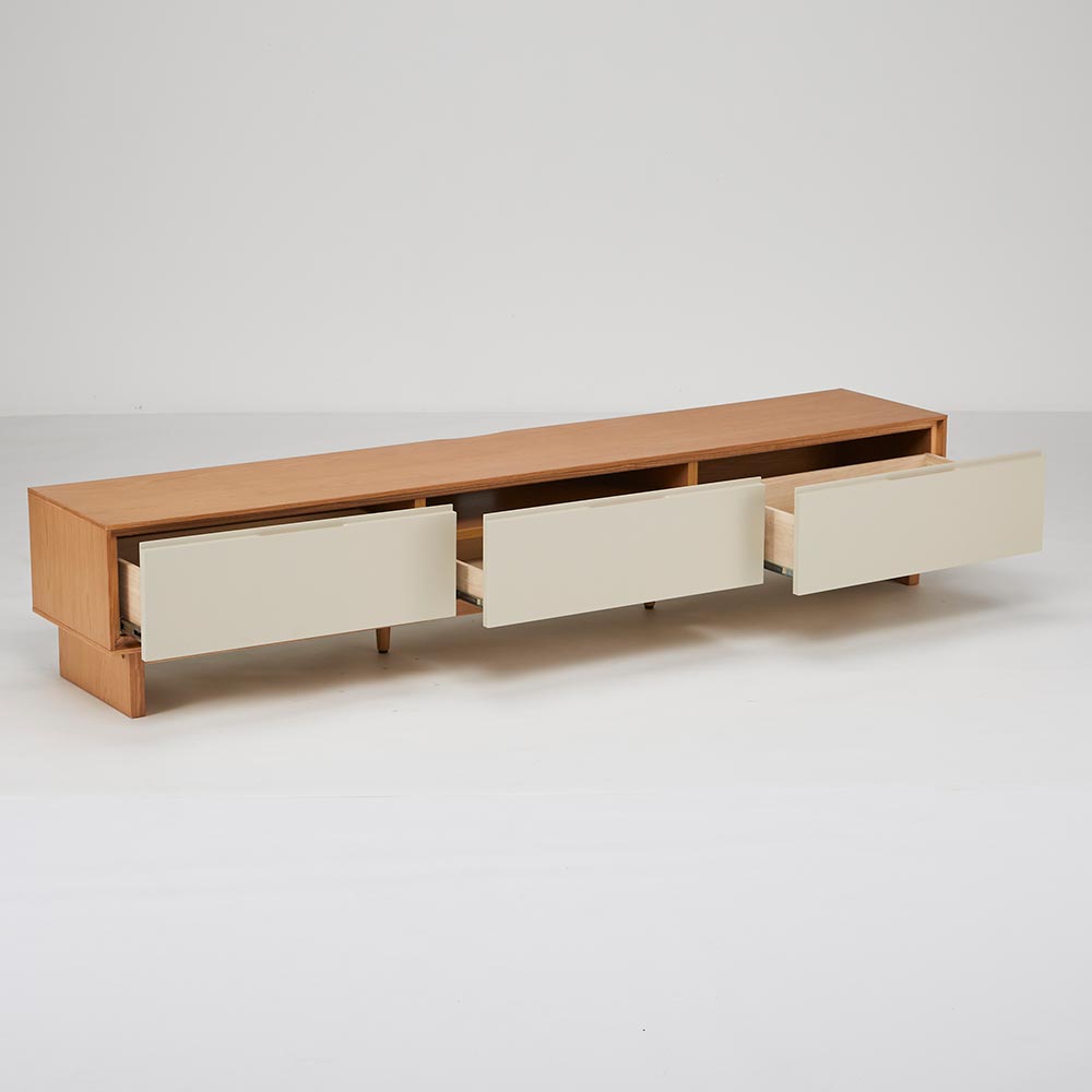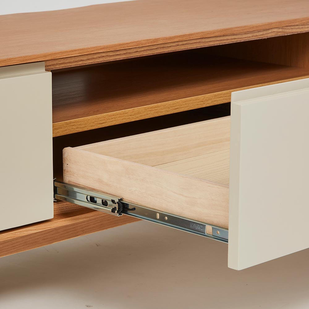 ・3杯の引き出しは収納物に合わせて整理できる2サイズ。雑誌やリモコン等は高さ6.5cmの中央引き出しに。
