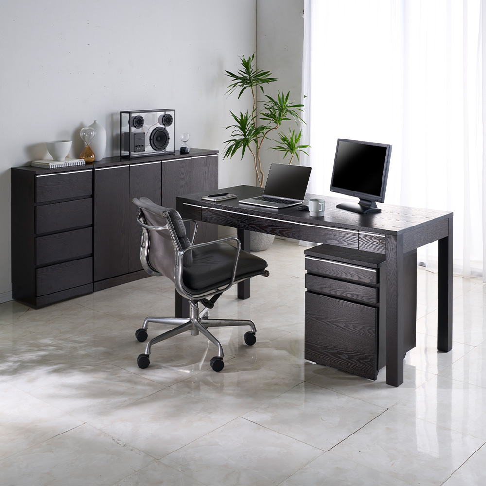 同シリーズにはデスクのほか、袖机タイプの「デスクワゴン」、資料整理に欠かせない引き出し4段の「チェスト」、ファイルボックスなども入る扉開閉の「キャビネット」2サイズもご用意。寝室やリビングの一角を利用してコンパクトなワークスペースをつくることも可能で、思いのままにワークスペースを構築できます。