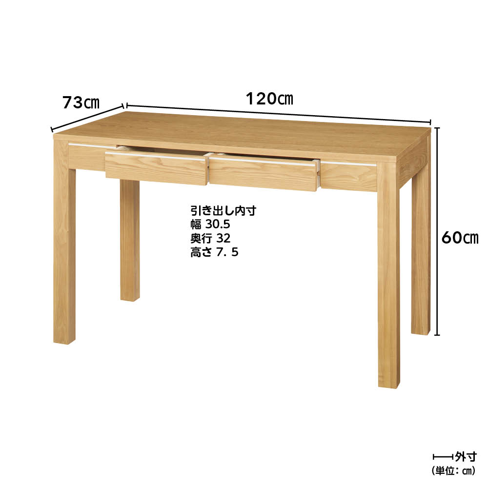 幅100cm・幅120cm・幅150cmの3サイズ。奥行はいずれも60cmで、奥に資料や本を置きながら手前でノートパソコンを使うことなども可能。幅120cmタイプは複数の書類を広げながらパソコン作業をするにもゆとりのある、使い勝手のよいサイズ感です。