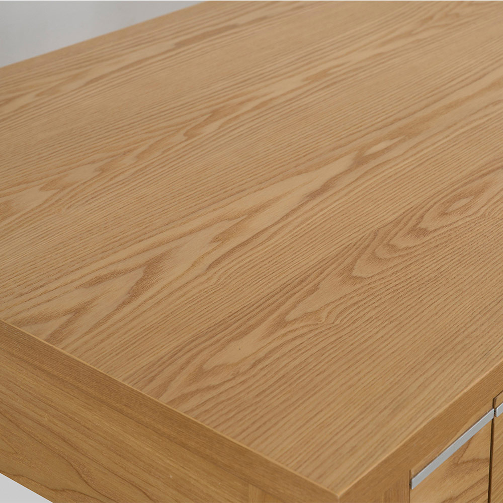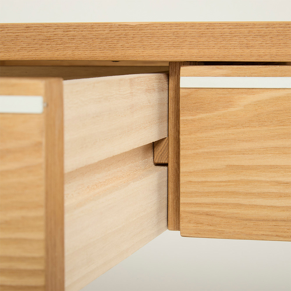 天板だけでなく、引き出し前板や脚部にも天然木をたっぷりと使用。はっきりとした木目で、1点1点異なる表情が楽しめます。アクセントに施されたアルミラインは、表面に溝を彫って埋め込むという手間ひまかかった職人仕事です。