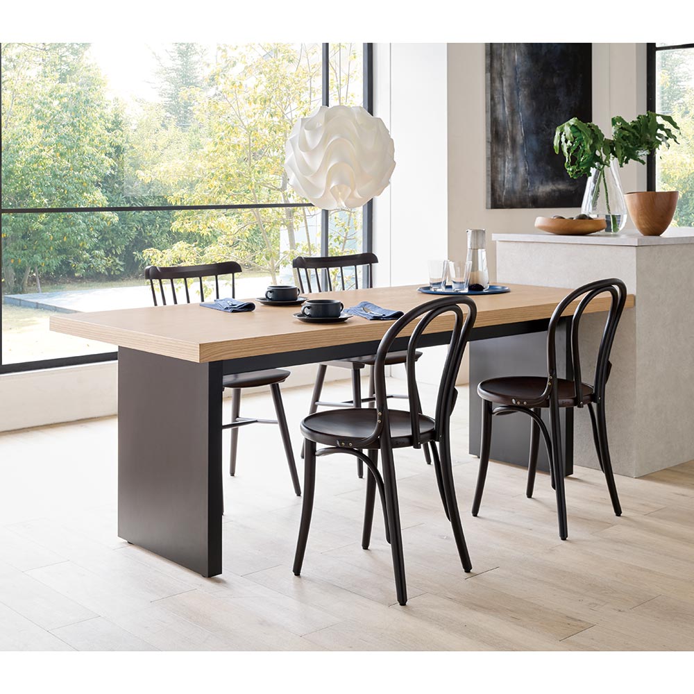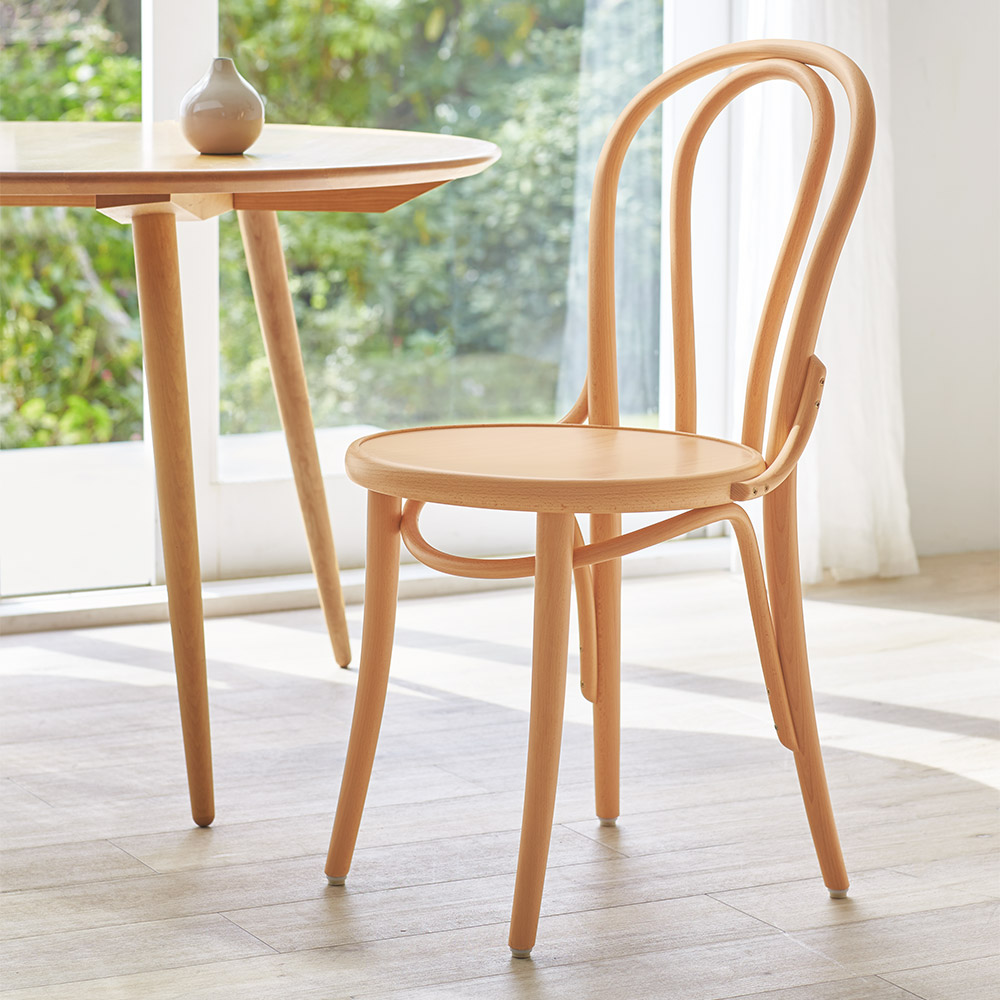 天然の無垢材を緩やかに曲げて描く優美なライン。後世のデザインにも多大な影響を与え、ヨーロッパの椅子の歴史を語る上でも重要なTONの曲げ木チェア。9つの部材だけのシンプルな構造で、曲げ木椅子の魅力である軽さを実現しています。片手で簡単に持ち運ぶことができるので、お掃除の際に移動させるのが苦になりません。ダイニングチェアとしてはもちろん、玄関で、寝室で、リビングのアクセントとして、さまざまなシーンで使いこなす楽しみがあります。