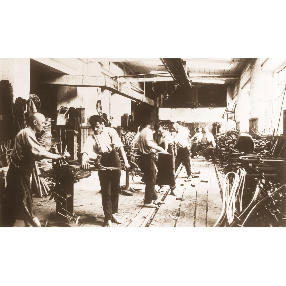 1920年頃の工場での曲げ木の工程。現在でもほぼ同様の技術で生産されています。