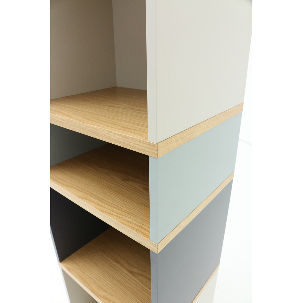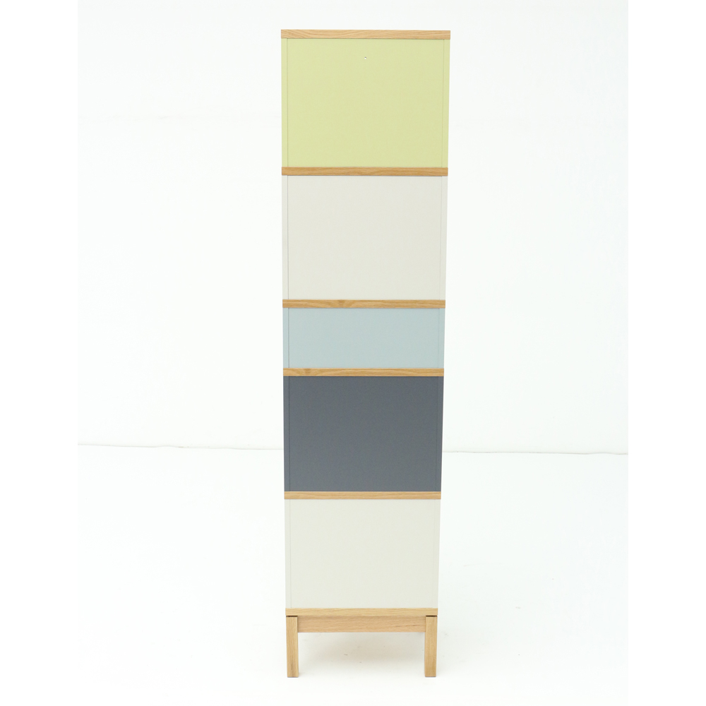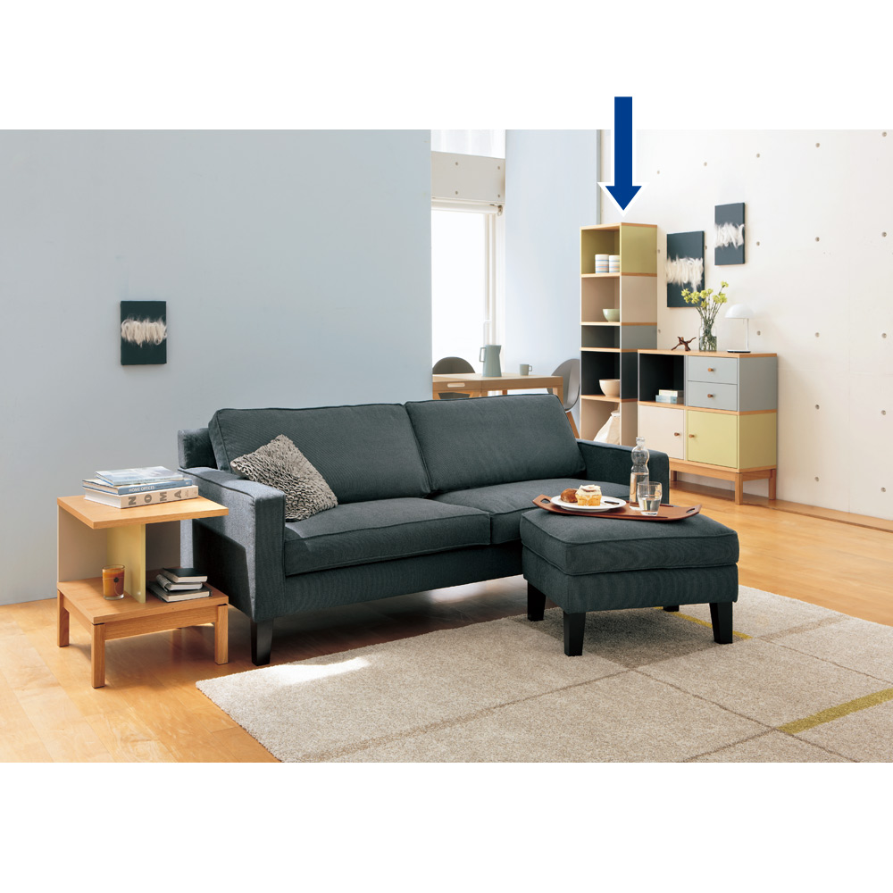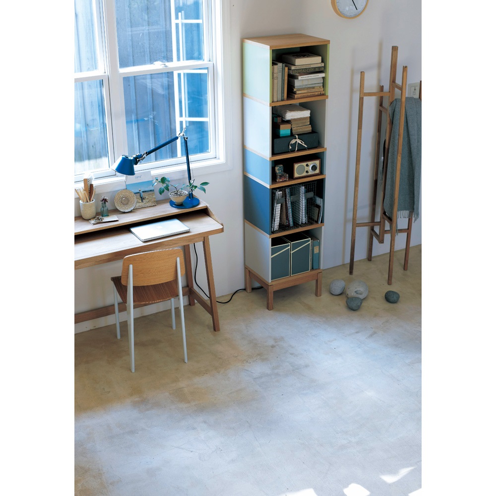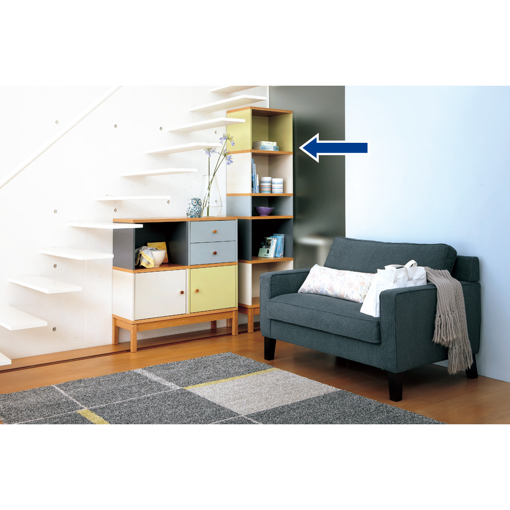お部屋にフォーカルポイントを作るのがインテリア上級者の技。異なる色のパネルが印象的な細身の本棚は、置くだけで魅力的なコーナーが完成します。