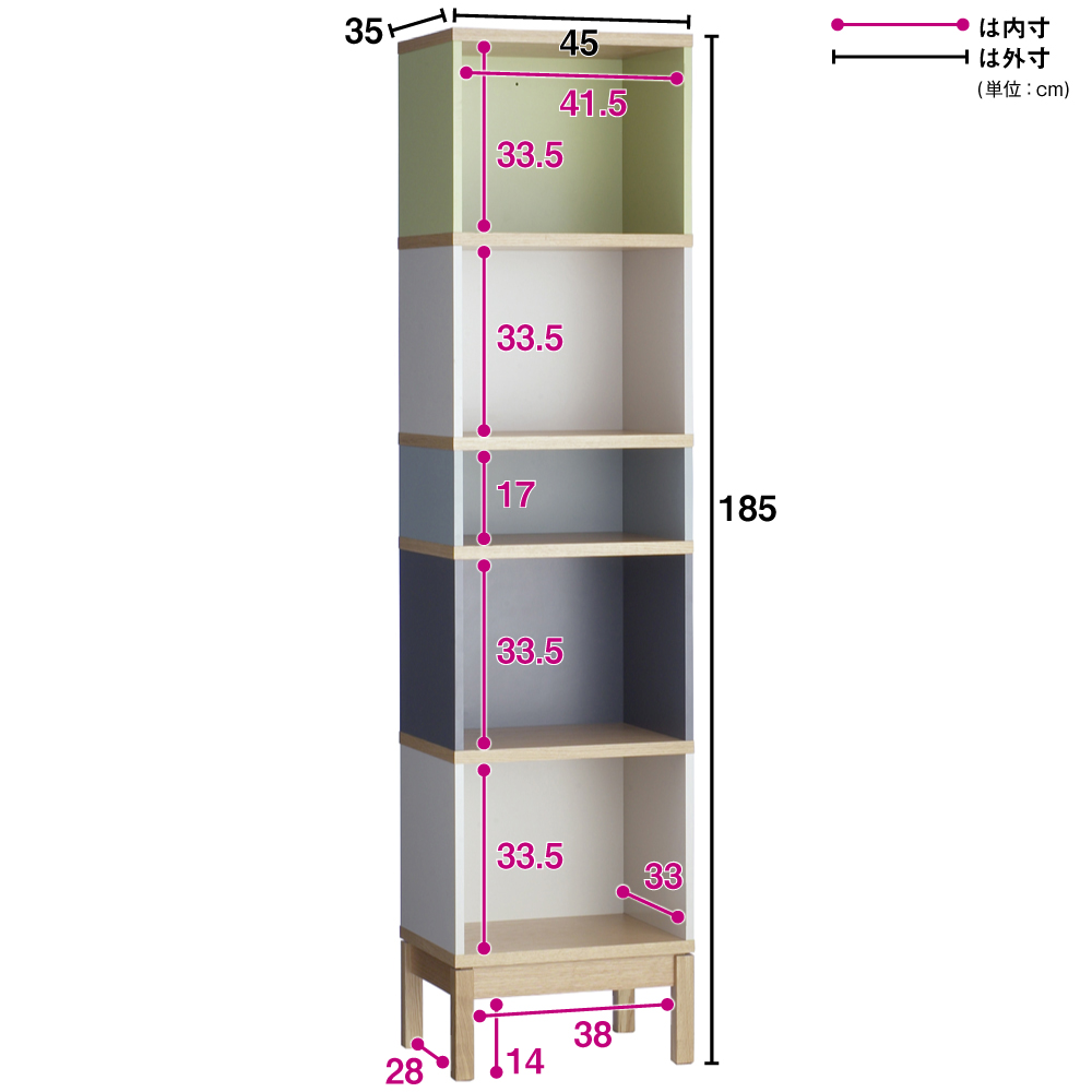 内側も側面もカラフル。収納部内寸…幅41.5奥行33高さ中段17その他33.5cm