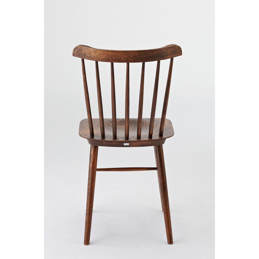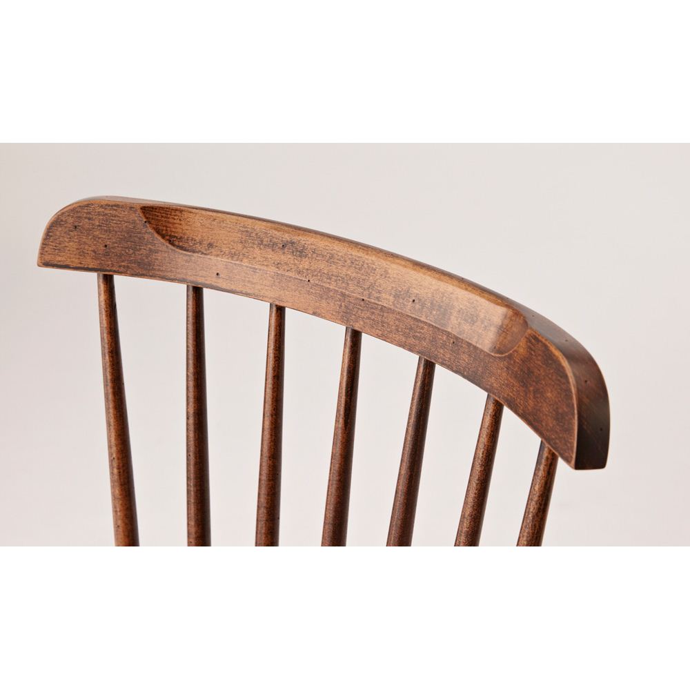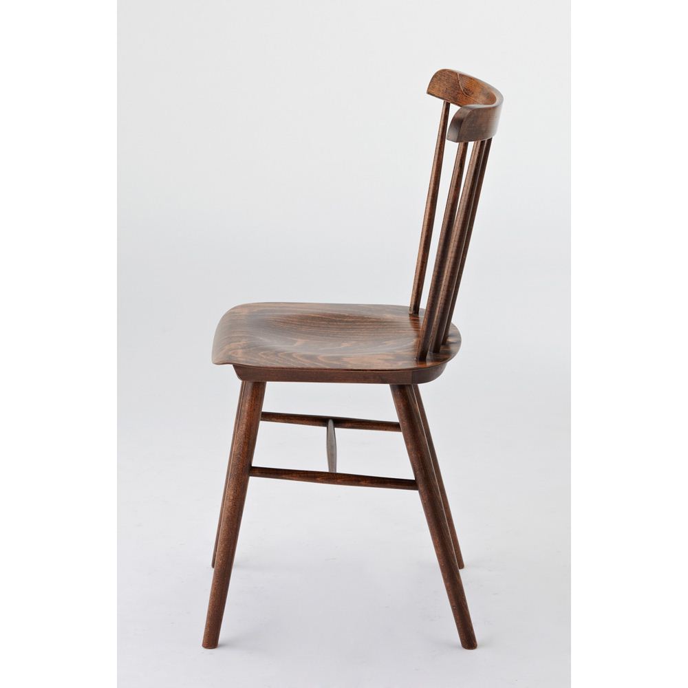 その歴史は16世紀の挽物椅子まで遡るといわれ、現代機能主義デザインの源流ともいわれるウィンザーチェア。TON社では、厚い座板や細い背棒など伝統のスタイルは忠実に継承しながら、座面下部のテーパー加工や湾曲した背あて板などを独自の工夫を凝らしています。長年使い込んだような味わい深い風合いのアンティーク調の塗装は、世界中からTON社に最も多く注文があるフィニッシュです。