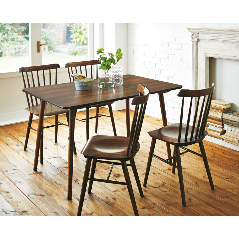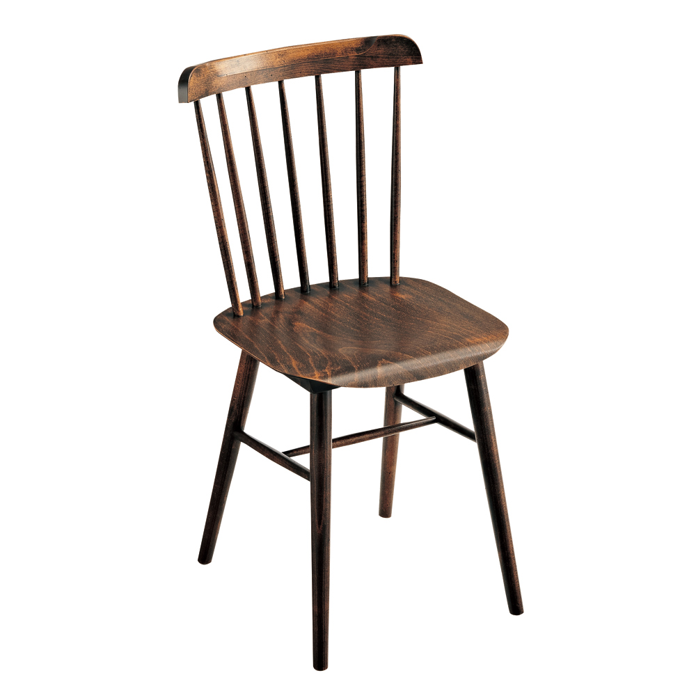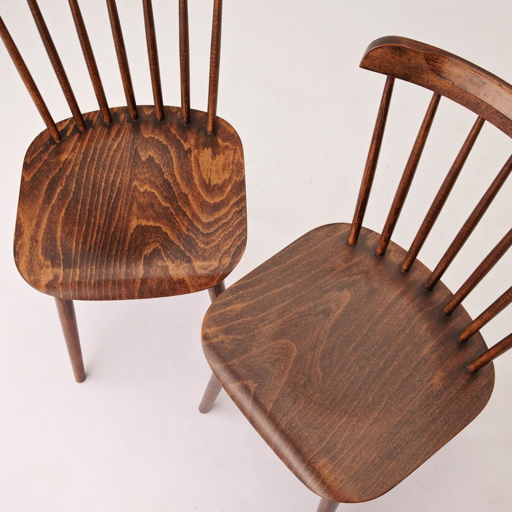 その歴史は16世紀の挽物椅子まで遡るといわれ、現代機能主義デザインの源流ともいわれるウィンザーチェア。TON社では、厚い座板や細い背棒など伝統のスタイルは忠実に継承しながら、座面下部のテーパー加工や湾曲した背あて板などを独自の工夫を凝らしています。長年使い込んだような味わい深い風合いのアンティーク調の塗装は、世界中からTON社に最も多く注文があるフィニッシュです。